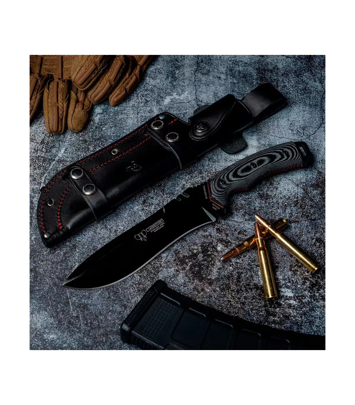 Con su mango de micarta negra y su hoja de acero inoxidable, este cuchillo táctico es resistente y duradero. Además, viene con una funda de cuero multifunción de color negra que contiene una piedra de afilado, lo que te permite mantener la hoja siempre afilada y lista para utilizar.