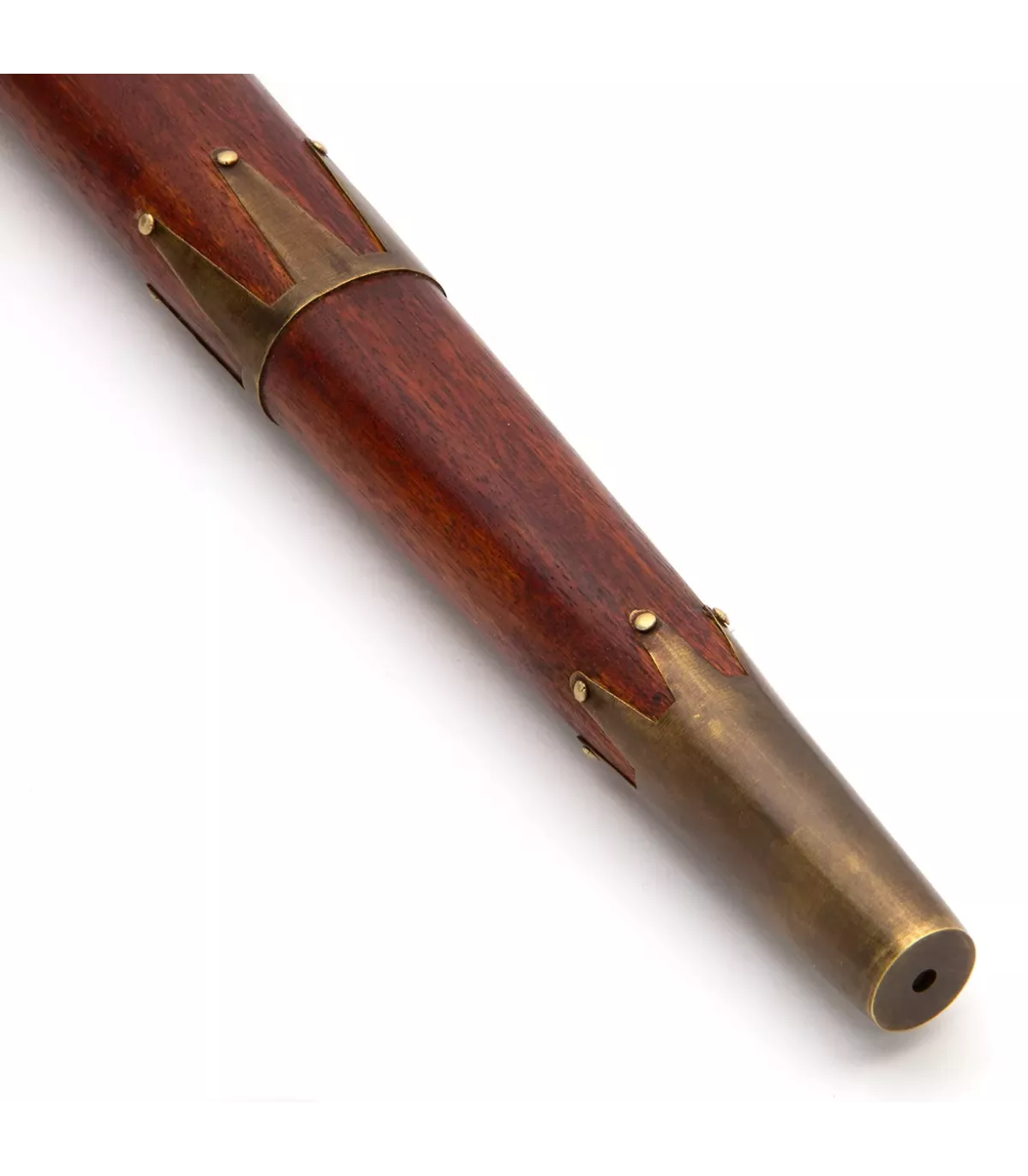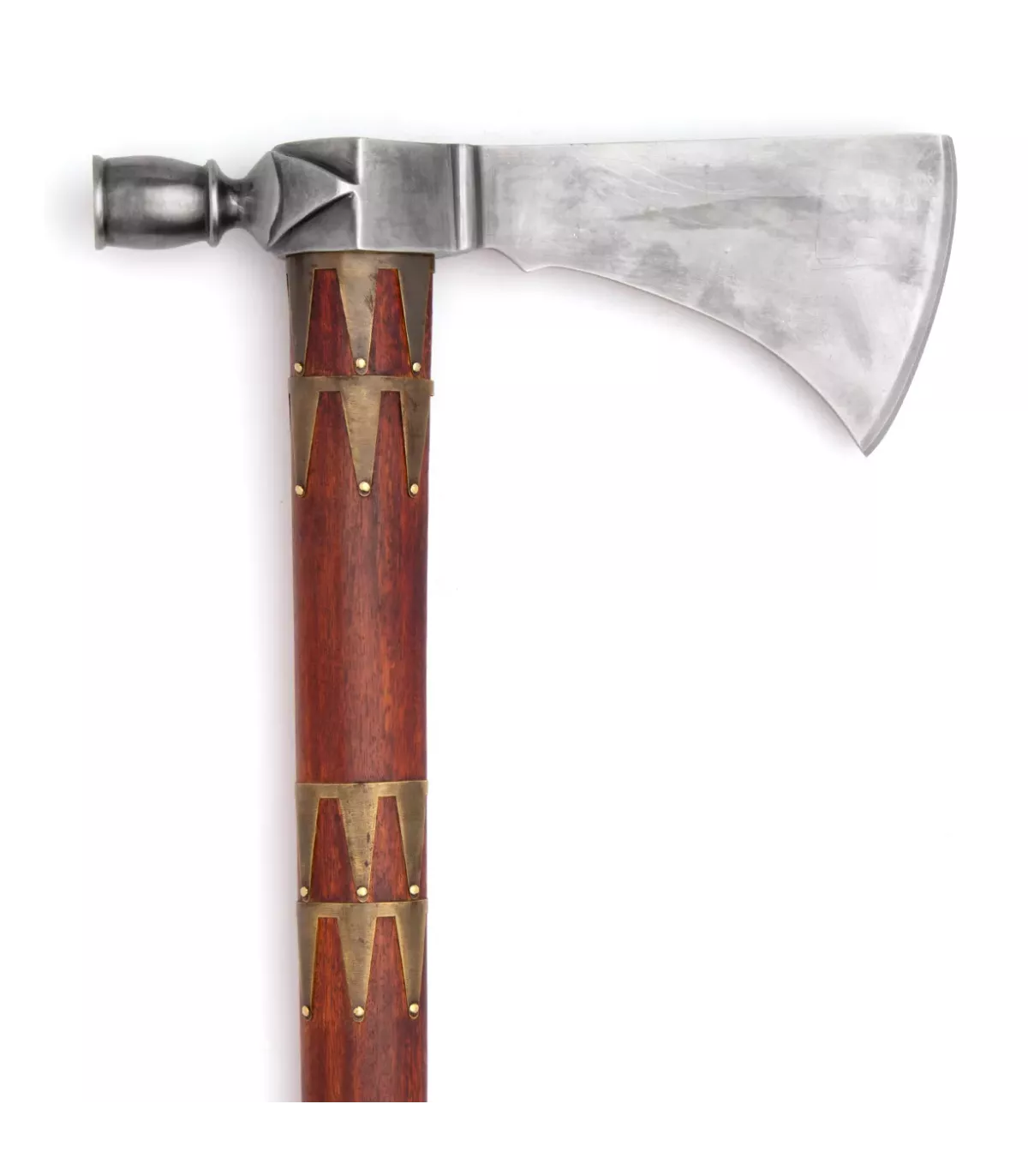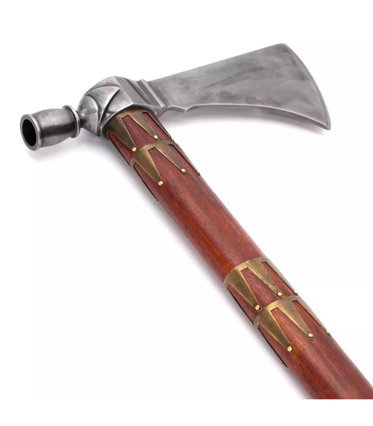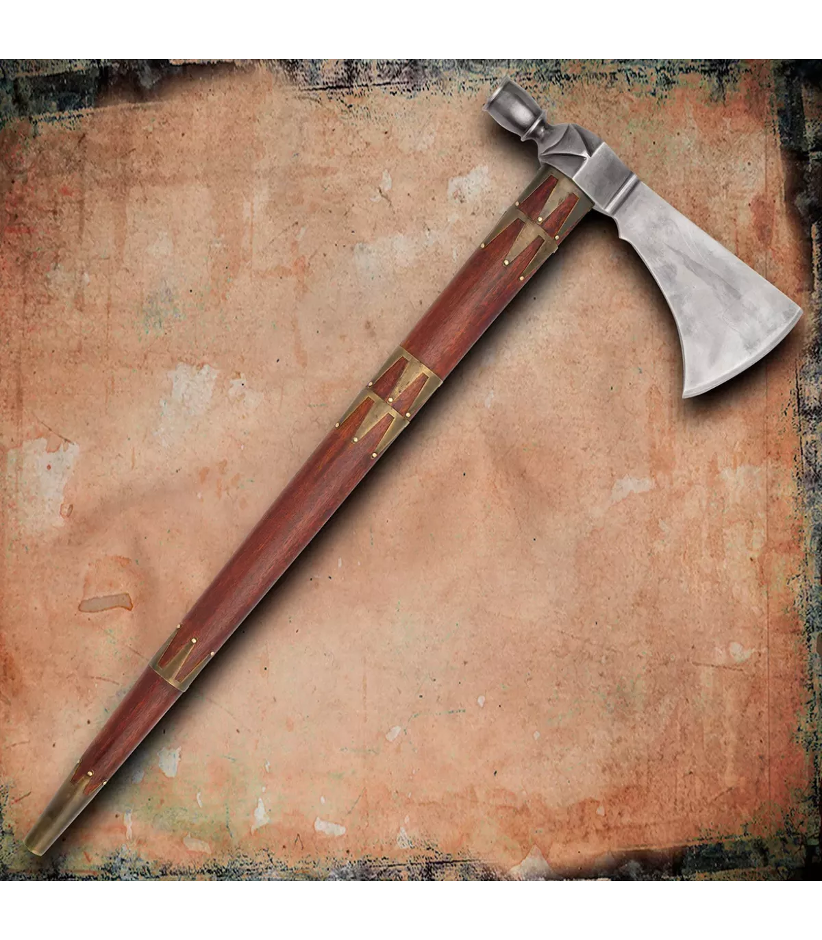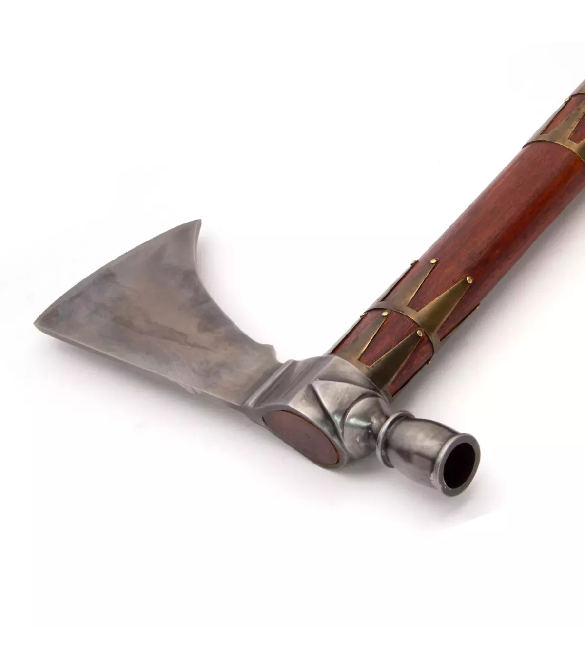 Con su cabeza forjada en acero con alto contenido al carbono, esta pipa-tomahawk es resistente y duradera, y su mango de madera tallado a mano, decorado con bandas de latón, es una verdadera obra de arte. Además, su diseño único y ornamentado con grabados la hace perfecta para exhibir en cualquier colección.
