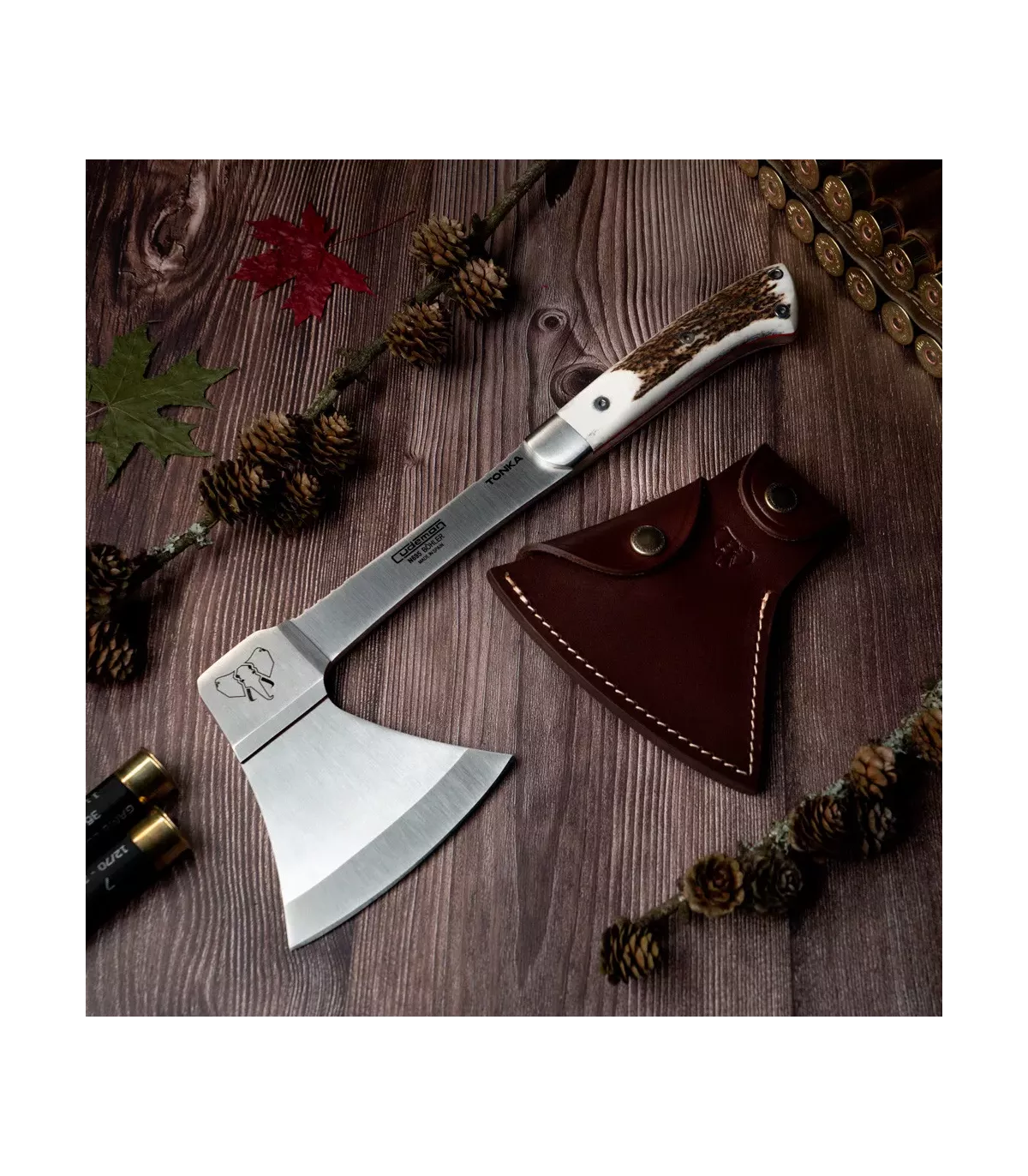 Pero lo que realmente hace destacar a esta hacha es su mango hecho de asta de ciervo. No solo le da a la herramienta un aspecto impresionante, sino que también es cómodo de sostener y te ayuda a tener un agarre firme mientras la usas. Además, la funda de cuero que viene con el hacha te permite llevarla contigo de manera segura y protegerla cuando no la estás usando.