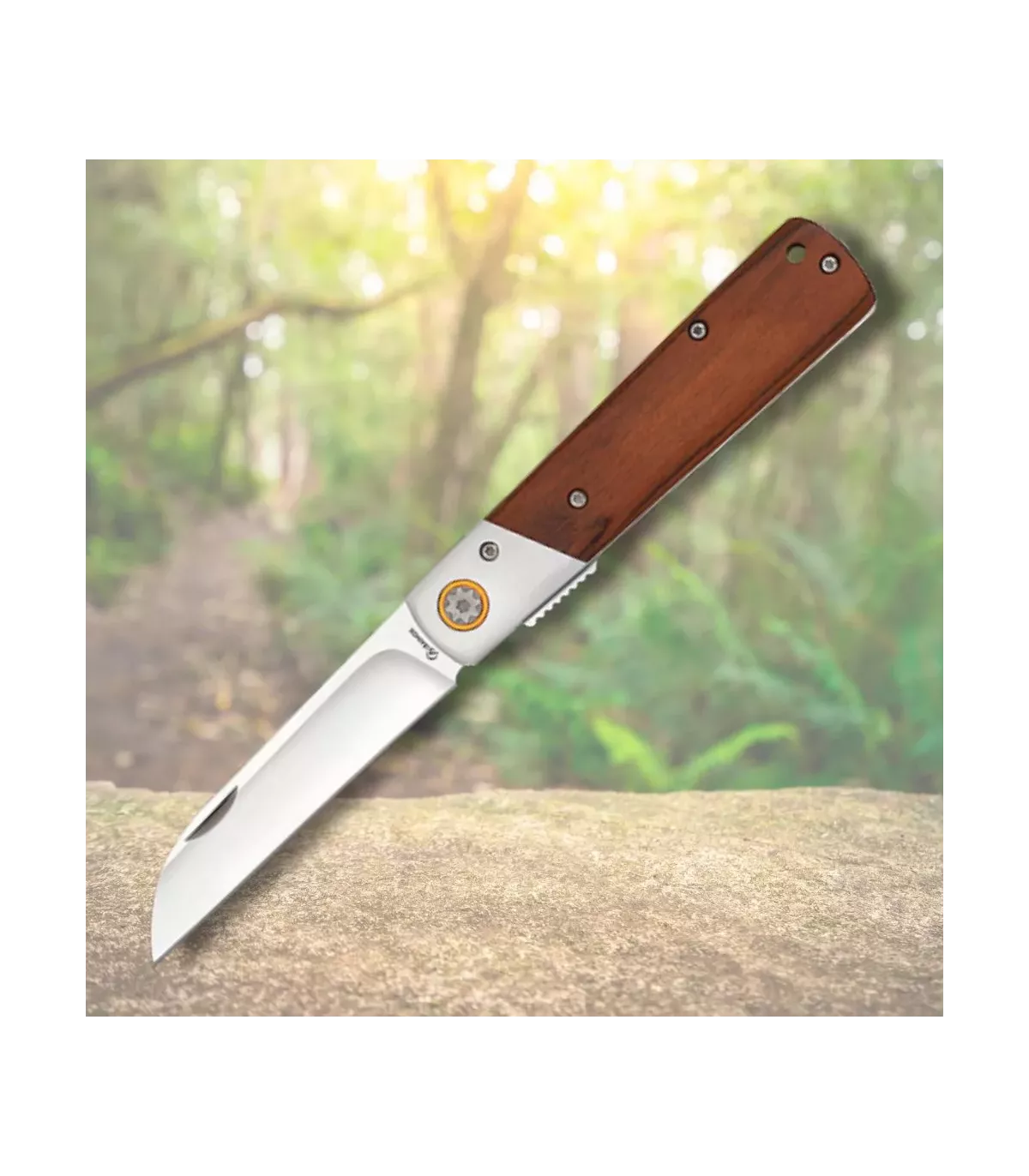 Imagina tener en tus manos una herramienta que combina robustez y elegancia, diseñada para acompañarte en cada aventura con total confianza. Esta navaja, con su diseño de hoja pico loro, ofrece un corte preciso y eficiente, ideal para cualquier tarea en el campo o en el día a día.