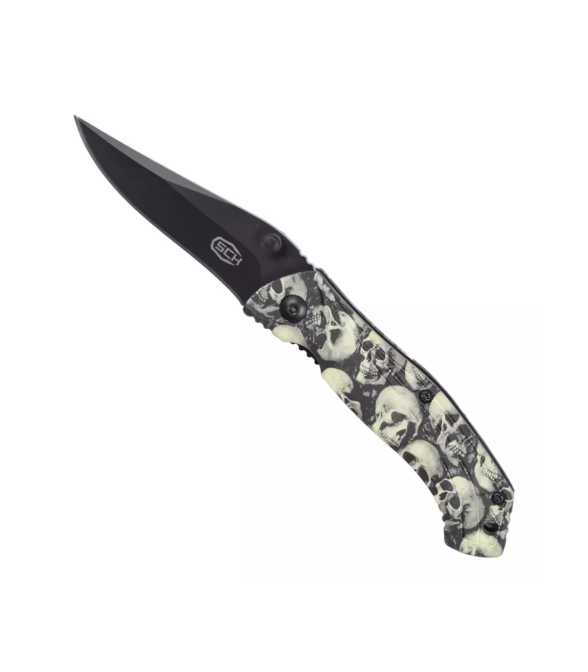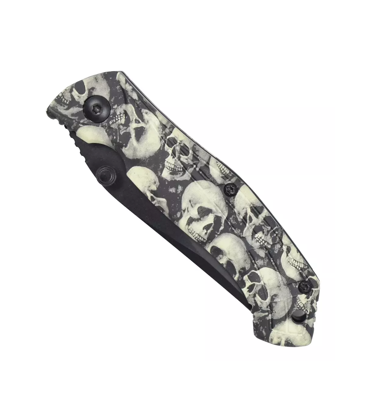 Descubre una herramienta que no solo es práctica, sino que también destaca por su estilo audaz. Esta navaja de campo con un exclusivo diseño en el mango, adornado con calaveras, es la elección perfecta para quienes buscan funcionalidad y un toque de personalidad en su equipo.