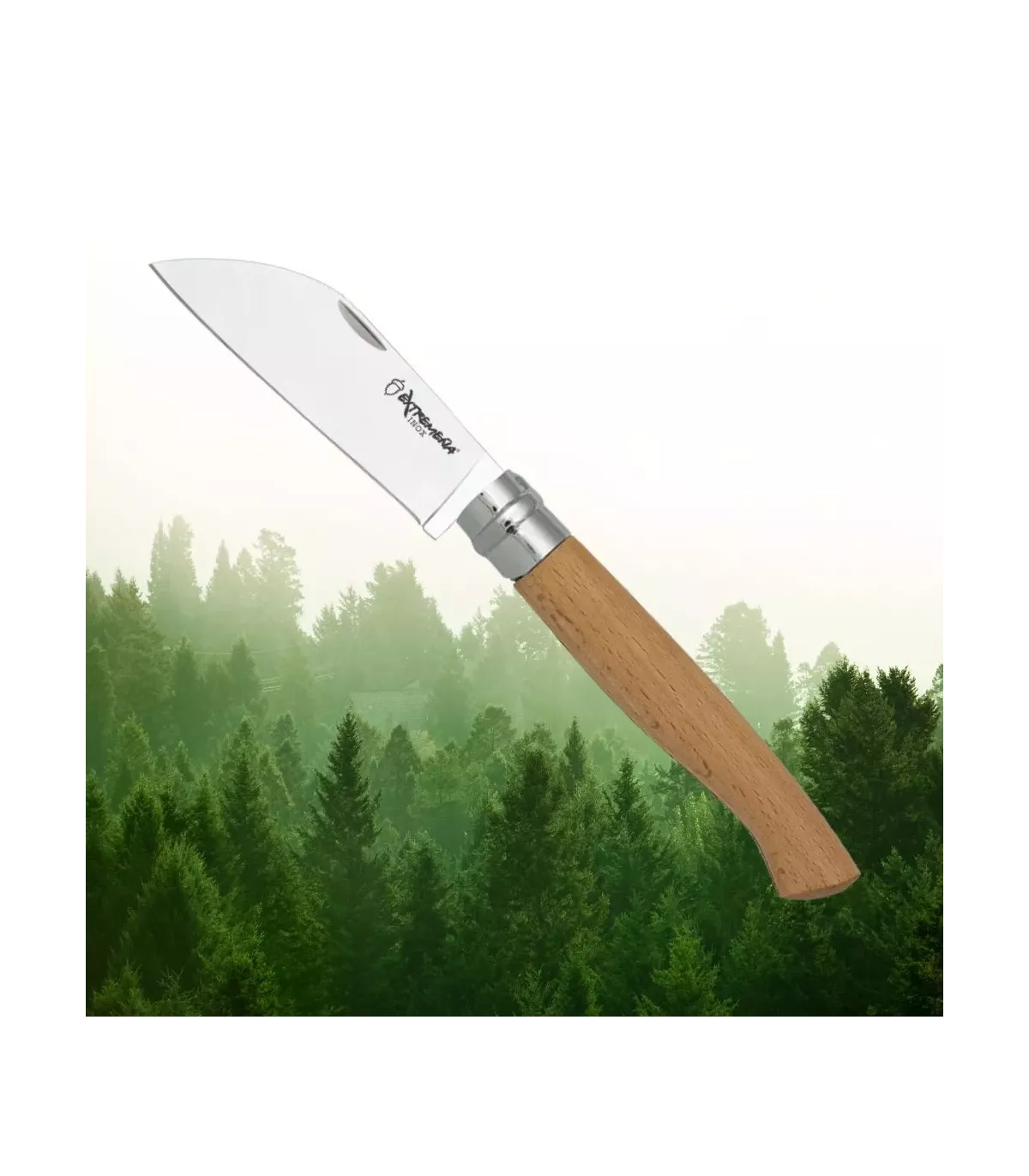 El mango, elaborado en madera natural con un acabado liso y un diseño ergonómico, asegura un agarre cómodo y firme, perfecto para un uso prolongado. Entre la hoja y el mango, la virola metálica añade un toque de estilo y refuerza la estructura de la navaja, asegurando su durabilidad.