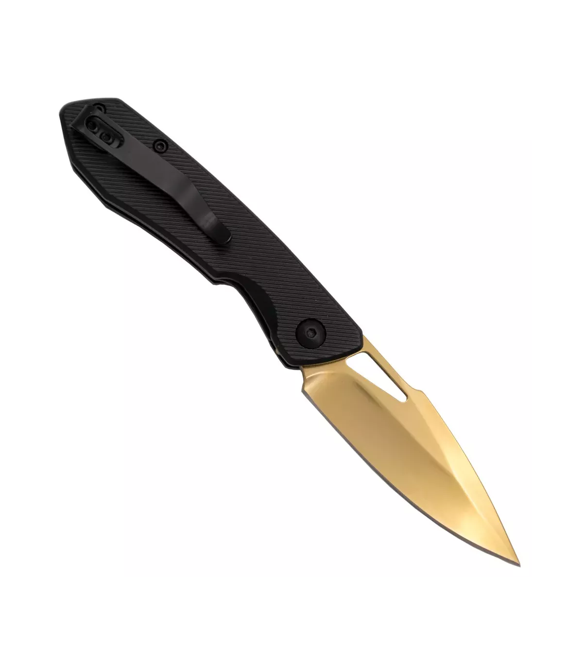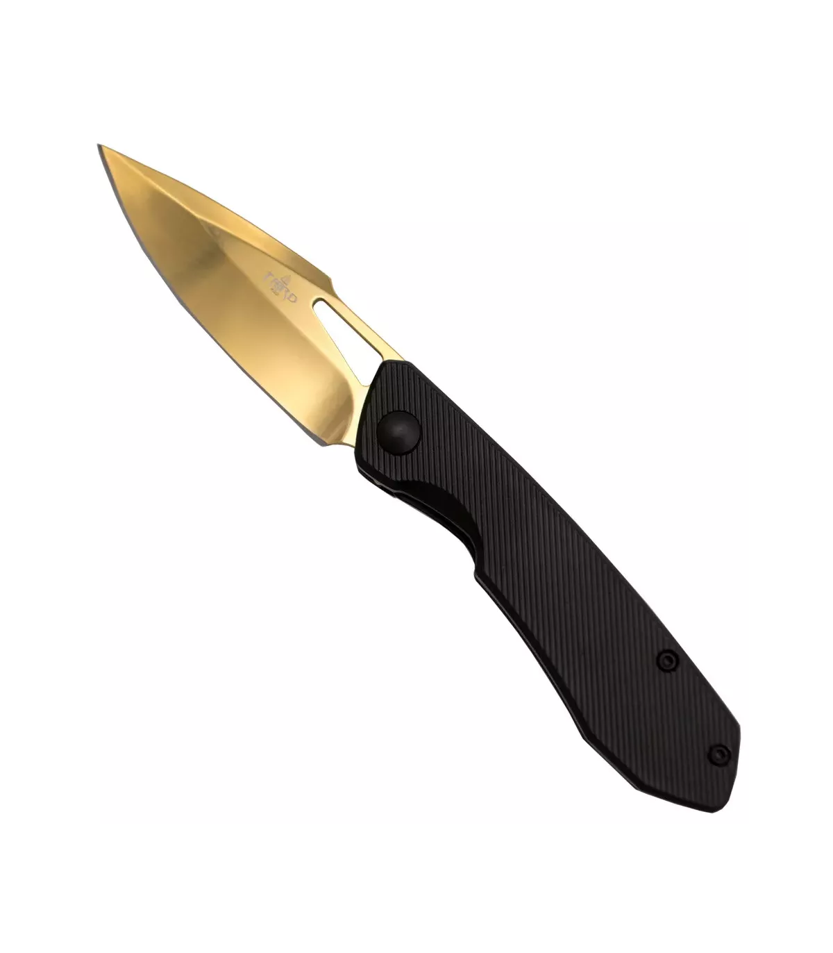 El mango, hecho de aluminio negro con una textura que mejora el agarre, ofrece una sujeción cómoda y segura, permitiendo un manejo preciso en cualquier situación. Su diseño minimalista y robusto se complementa a la perfección con la hoja de 7 cm, acabada en un impresionante titanio dorado brillante. Esta hoja no solo destaca por su apariencia única, sino también por su durabilidad y resistencia al desgaste, lo que la convierte en una opción fiable para diversas tareas.
