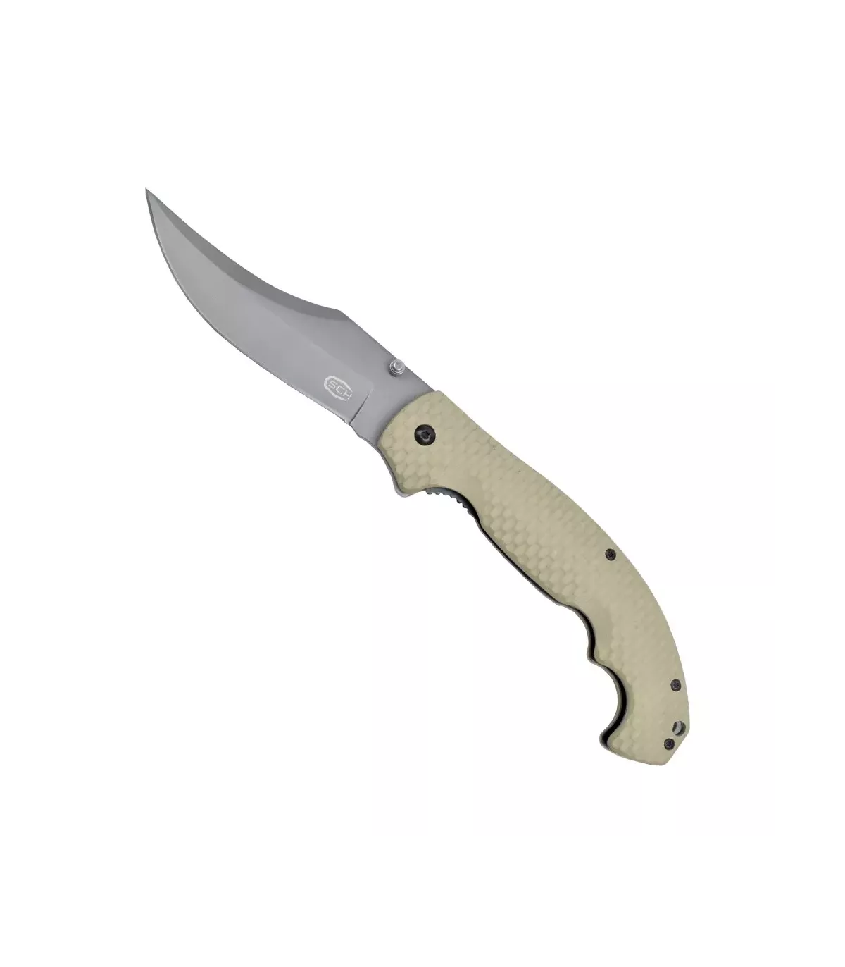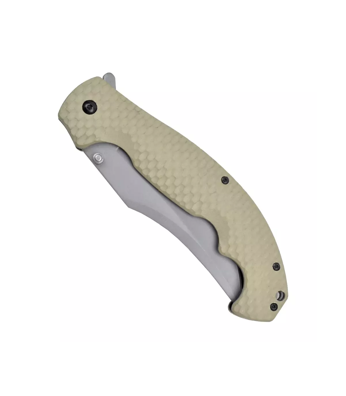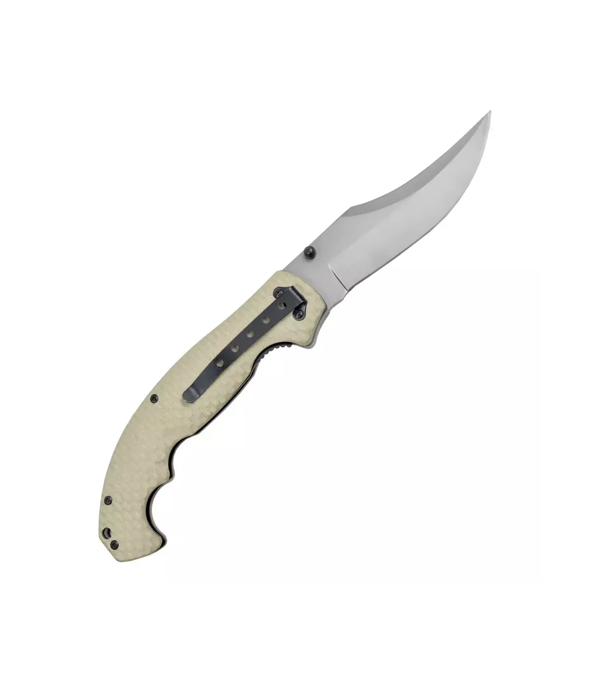 La hoja de acero inoxidable ofrece durabilidad y resistencia, lista para enfrentar cualquier desafío que se presente. El mango de laminado de fibra de vidrio G10 proporciona un agarre cómodo y seguro, incluso en condiciones húmedas o resbaladizas. Nuestra navaja de campo cuenta con un práctico clip para cinturón, lo que te permite llevarla contigo de manera conveniente y tenerla siempre a mano. El sistema de cierre con liner lock asegura una sujeción segura y estable durante su uso.