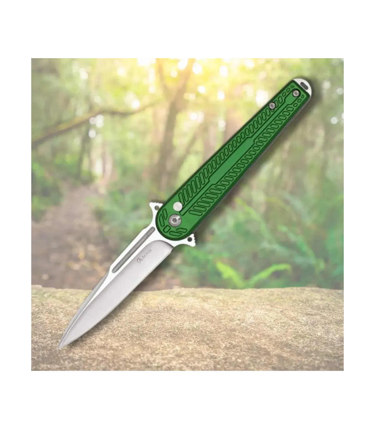 El mango de aluminio en verde no solo aporta un toque moderno y atractivo, sino que también garantiza un agarre seguro y cómodo gracias a su textura cuidadosamente diseñada. Con un clip integrado, podrás llevarla siempre a mano, lista para desplegar en cualquier momento con la rapidez que ofrece su sistema fliper y el sólido bloqueo de pistón, que asegura la hoja en posición para mayor protección.