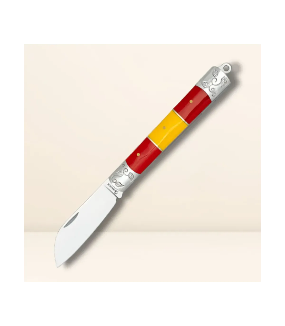 La empuñadura, decorada con los vibrantes colores rojo y amarillo, no solo es visualmente impactante, sino que también está diseñada para ofrecer un agarre cómodo y seguro. Cada corte se siente natural y controlado, gracias a su ergonomía pensada para el usuario. Además, el diseño metálico grabado en la parte superior añade un toque de distinción que lo convierte en un objeto de admiración.