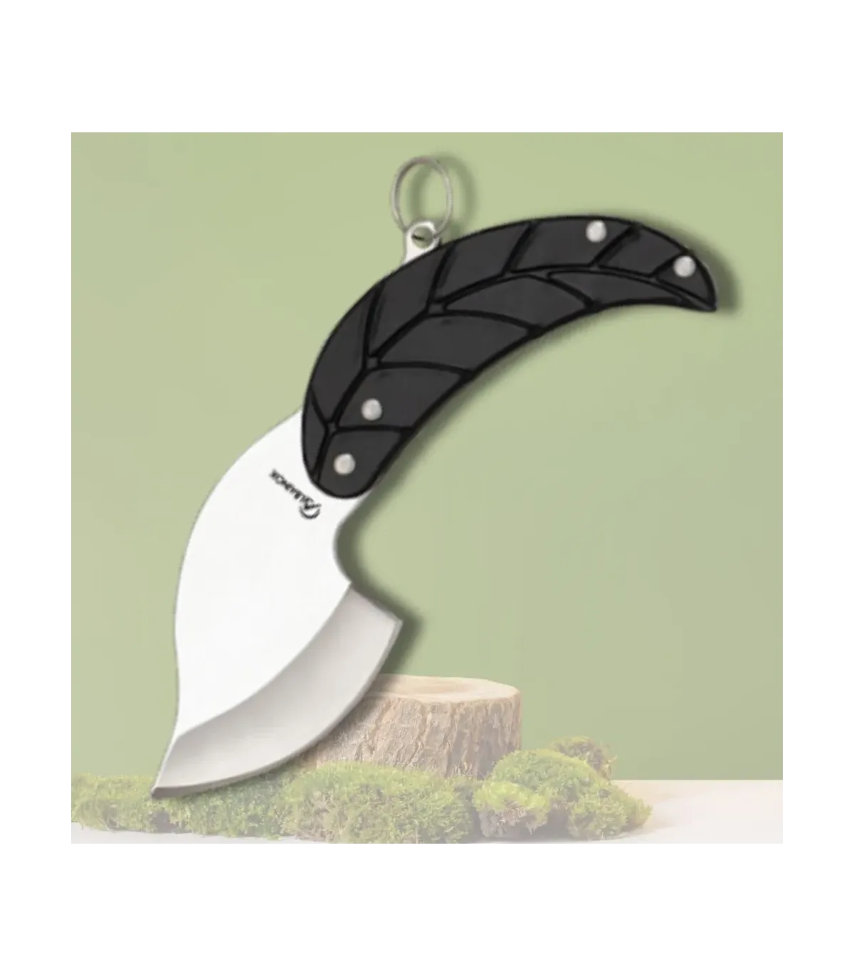 El mango, de un atractivo color negro, está diseñado para ofrecer un agarre seguro y cómodo. Su textura antideslizante te permitirá manejar la navaja con confianza, incluso en condiciones adversas. Los remaches visibles añaden un toque de robustez, asegurando que la hoja y el mango estén firmemente unidos, mientras que el anillo en la parte superior ofrece una opción práctica para colgarla o sujetarla.