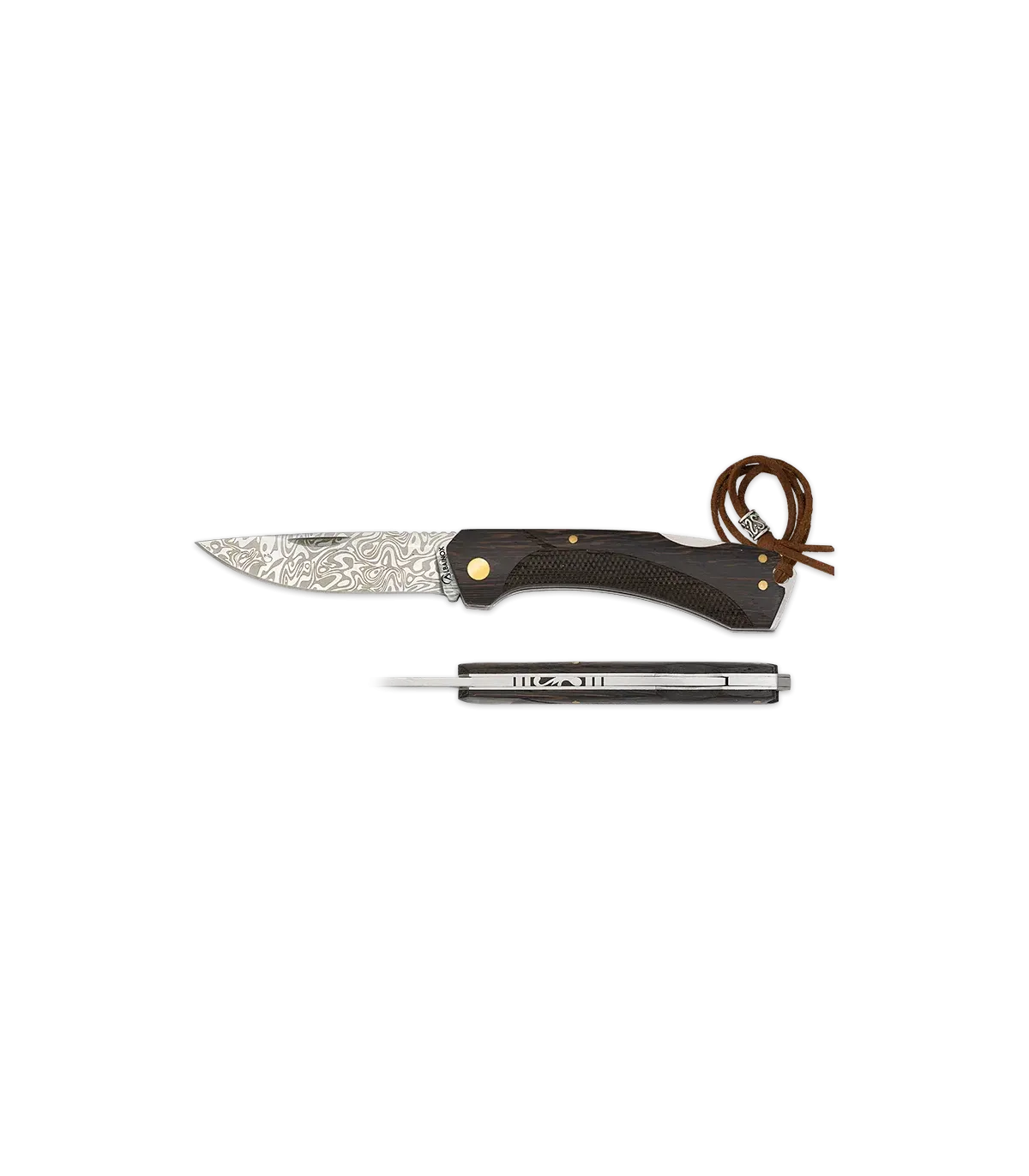 Mango de madera Wengué: El mango de madera Wengué le da a esta navaja un aspecto sofisticado y elegante. Su diseño ergonómico y detalles metálicos aportan comodidad y estilo al agarre. La cuerda incorporada y el CNC en la cacha brindan seguridad y precisión adicional.