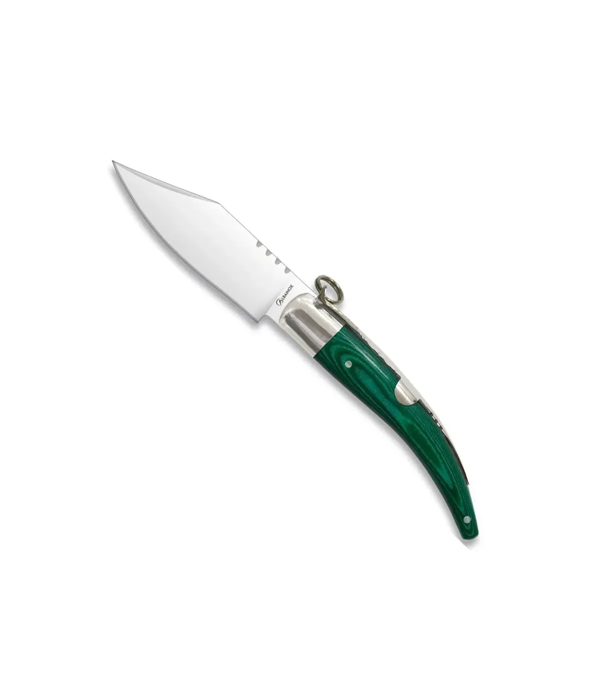 - Tipo de Bloqueo de Palanquilla con Anilla: La navaja viene equipada con un bloqueo de palanquilla que proporciona seguridad adicional durante su uso. La anilla no solo es práctica para colgarla, sino que también añade un toque único a su diseño.