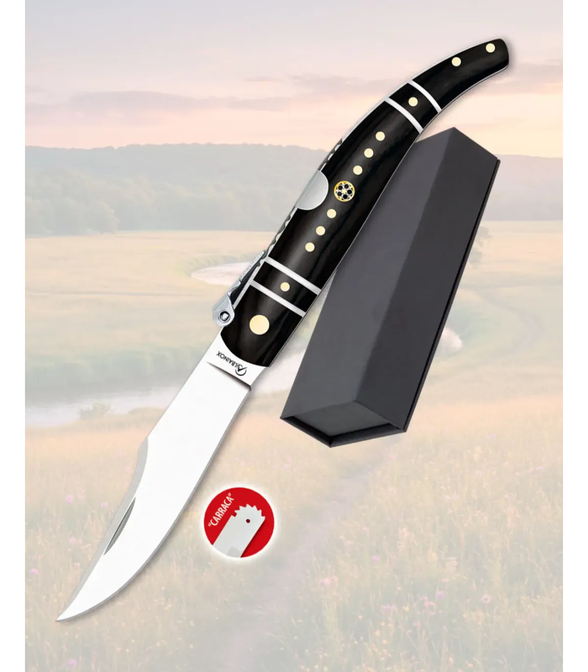 La hoja curva en acero carbono con acabado satinado ofrece un filo que responde con precisión, facilitando cortes limpios y controlados, mientras el pulido le aporta una apariencia elegante que no pasa desapercibida. El sistema de cierre tipo carraca, complementado con bloqueo de palanquilla, garantiza un funcionamiento seguro y fiable cada vez que la abres o la cierras, aportando tranquilidad en el uso cotidiano.