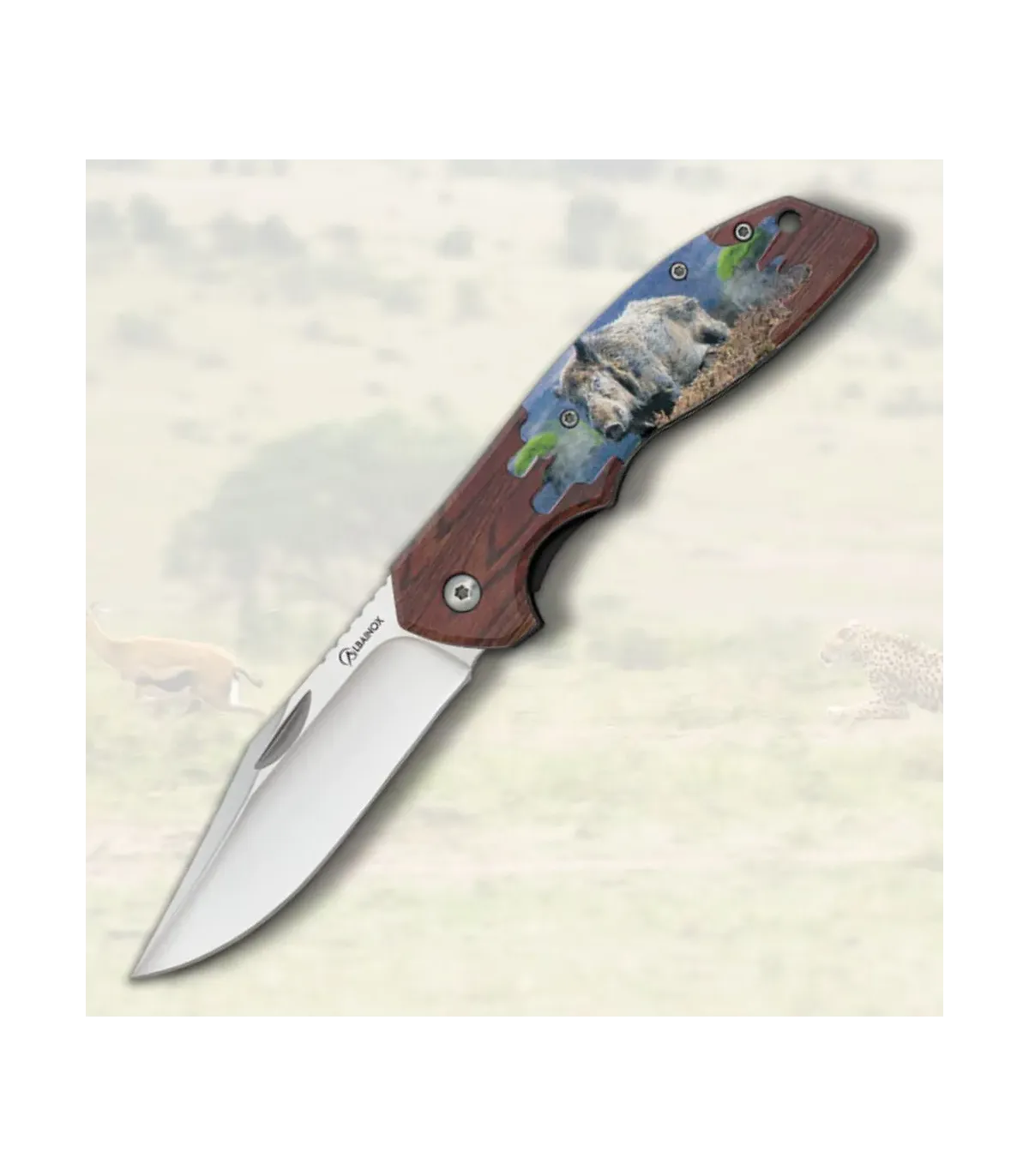 El mango, con un acabado que imita la madera, no solo aporta un toque natural y elegante, sino que también se adapta perfectamente a la forma de tu mano, asegurando un agarre cómodo y seguro. La ilustración de un jabalí en el mango añade un elemento decorativo que refleja tu pasión por la naturaleza y la caza.