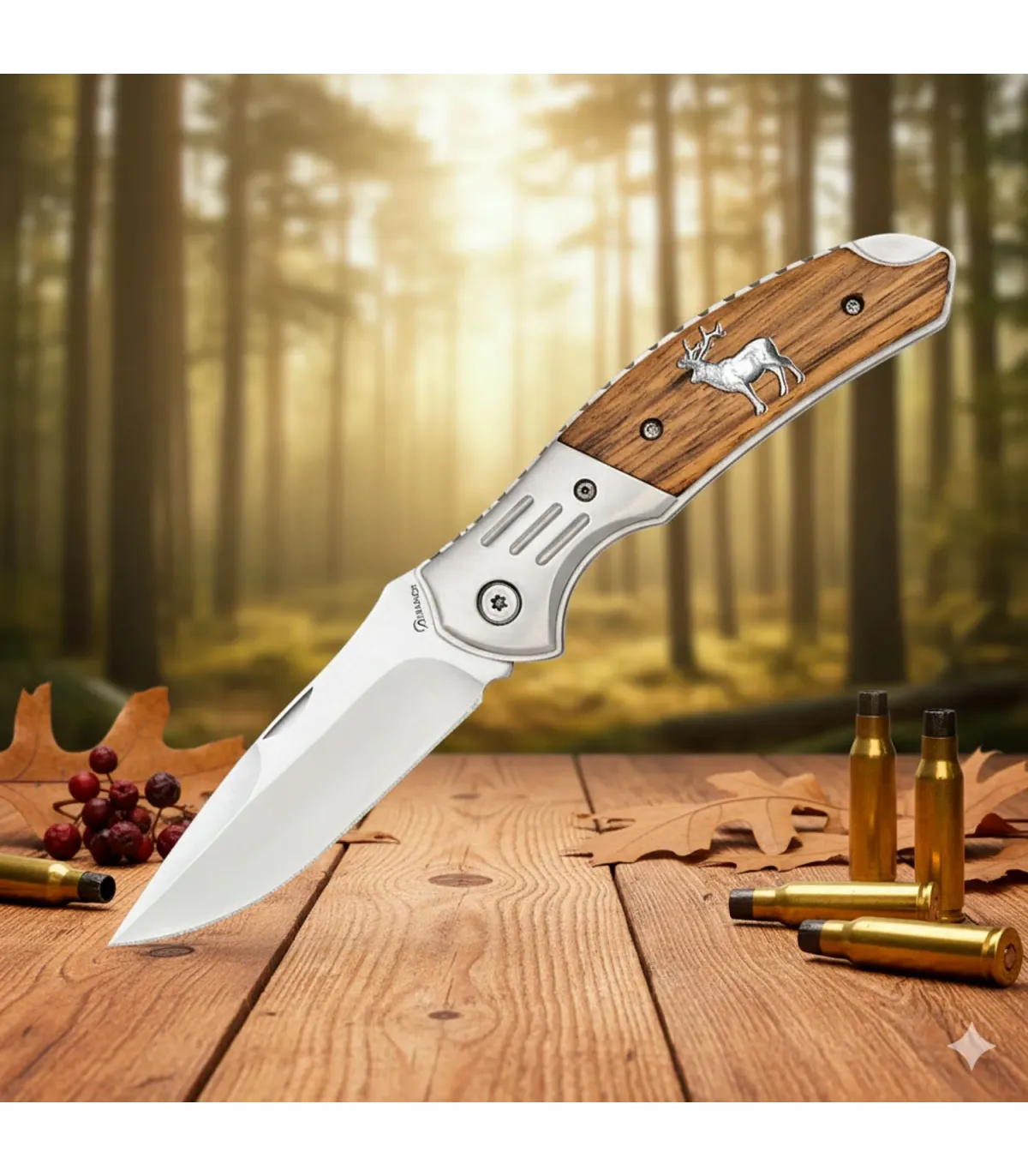 El mango de madera Zebra aporta un toque distintivo y cómodo, con detalles en metal que garantizan un agarre seguro y firme, incluso en condiciones delicadas. La imagen del ciervo en su superficie añade un toque de naturaleza y carácter, ideal para quienes valoran el estilo en sus herramientas de caza o outdoor.