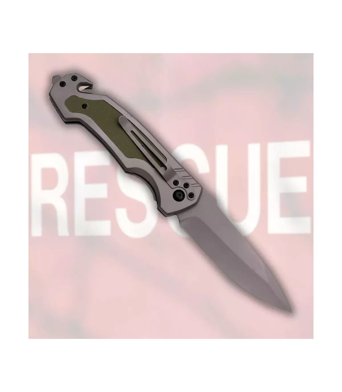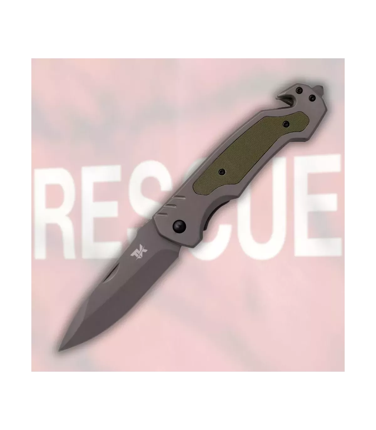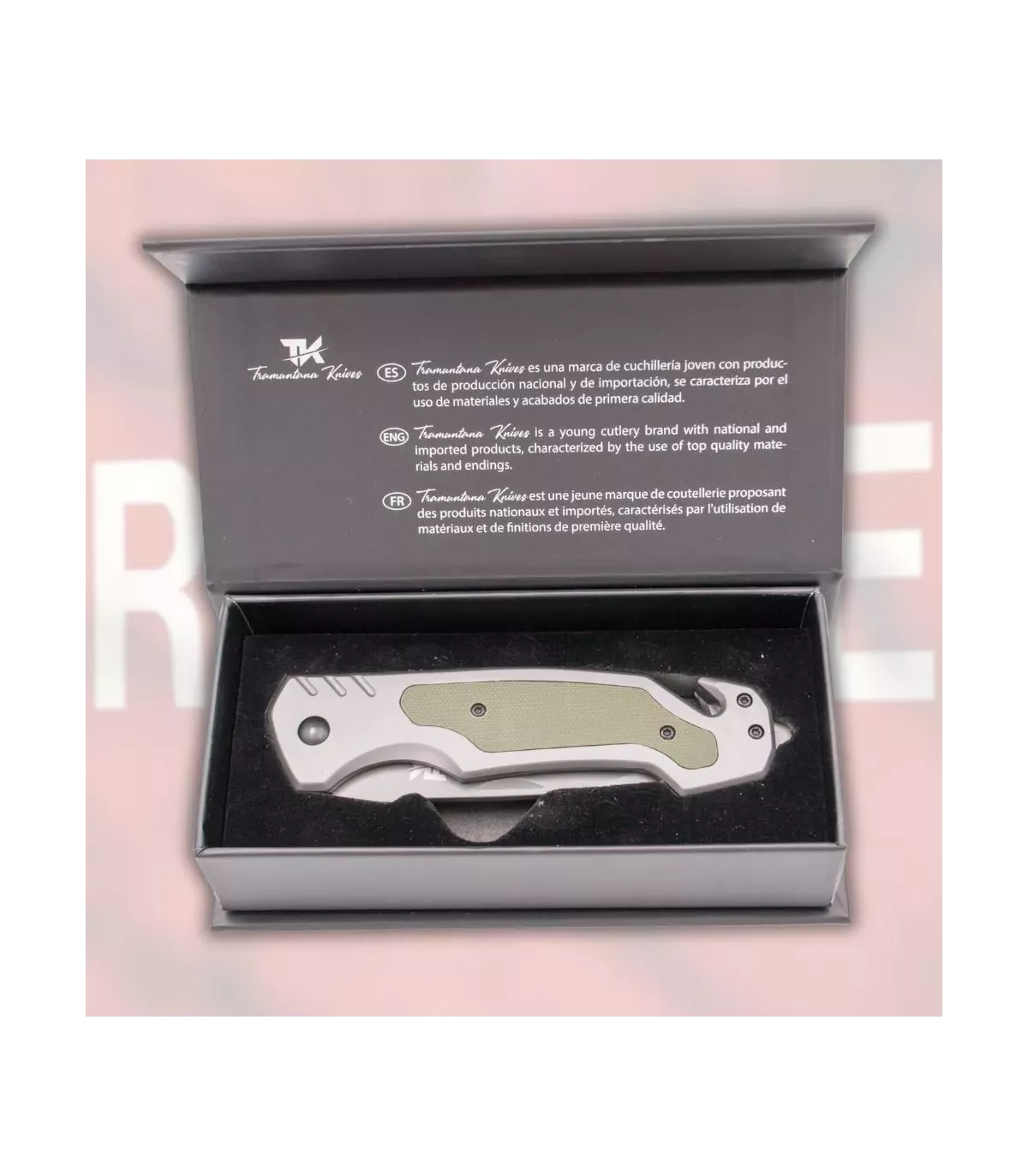 La navaja de rescate Tramuntana Knives N84V es una herramienta robusta y funcional, diseñada para situaciones de emergencia y uso diario. Este modelo destaca por su mango de acero bañado en titanio gris, que aporta resistencia y un acabado atractivo, complementado con una inserción de G10 verde con textura, lo que asegura un agarre firme y cómodo.