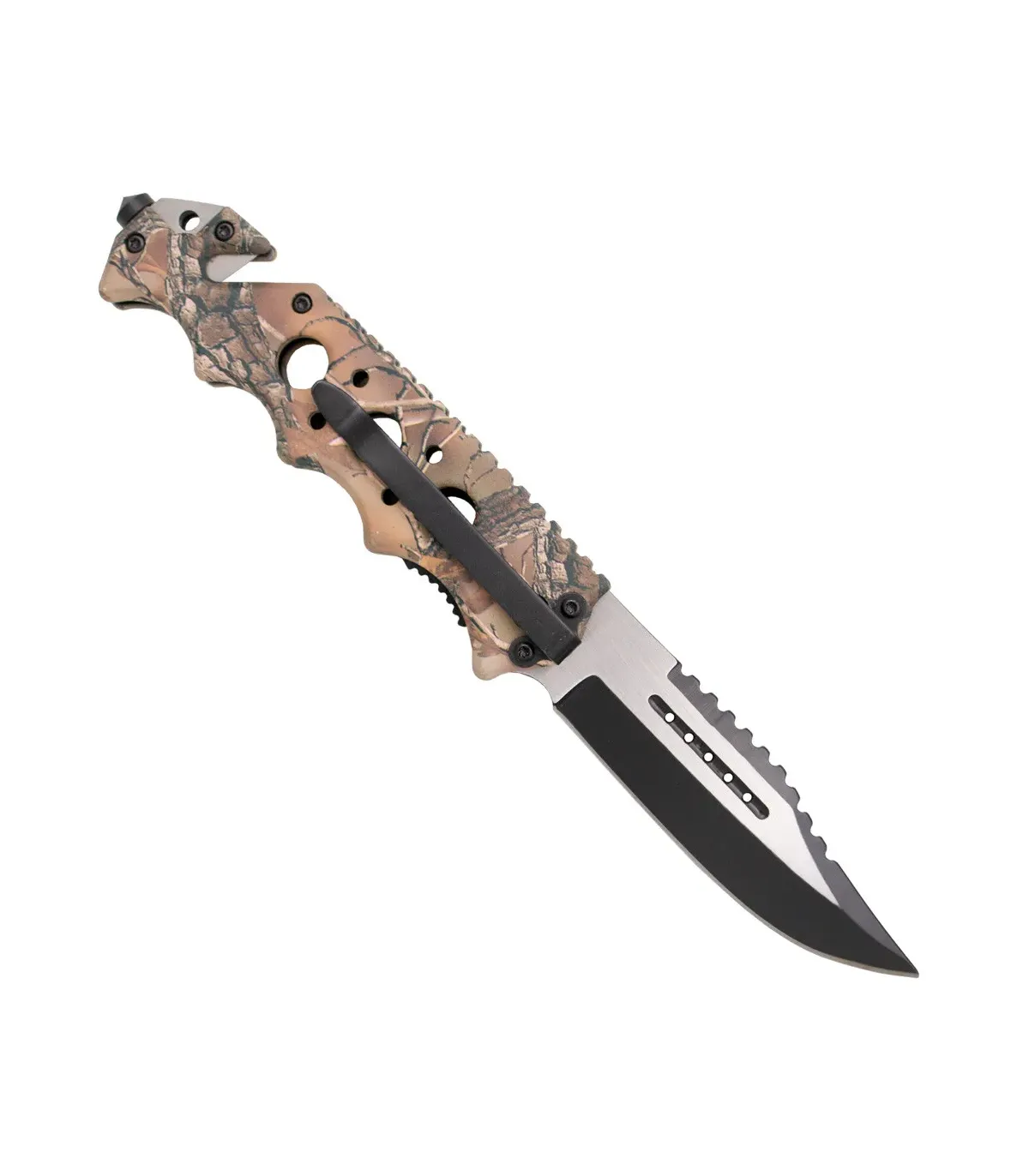 Descubre la navaja táctica Third diseño calavera en color madera, una herramienta que combina funcionalidad con un diseño audaz y atractivo. El mango de aluminio presenta un recubrimiento camuflado de bosque otoñal, decorado con agujeros y una calavera grabada, lo que no solo le da un aspecto distintivo, sino que también proporciona un agarre ergonómico y seguro.