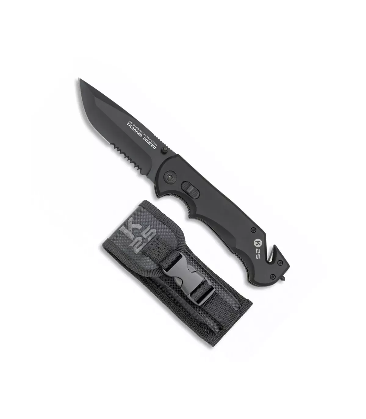 - Accesorios Cruciales para Emergencias: La Navaja K25 va más allá del corte básico. Incluye un cutter de cinturón doble para momentos de urgencia y una punta rompevidrio estratégicamente ubicada para situaciones críticas.