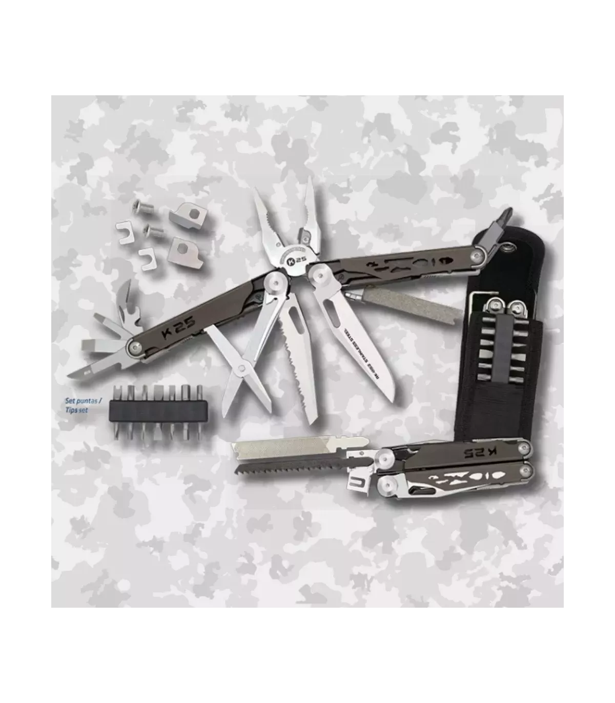 Pero eso no es todo, el alicate K25 incluye 14 puntas intercambiables y un práctico repuesto de cuchillas, lo que lo convierte en un aliado indispensable para cualquier proyecto. Y gracias a su funda de nylon, podrás llevarlo contigo a donde quiera que vayas, manteniendo todo organizado y accesible.