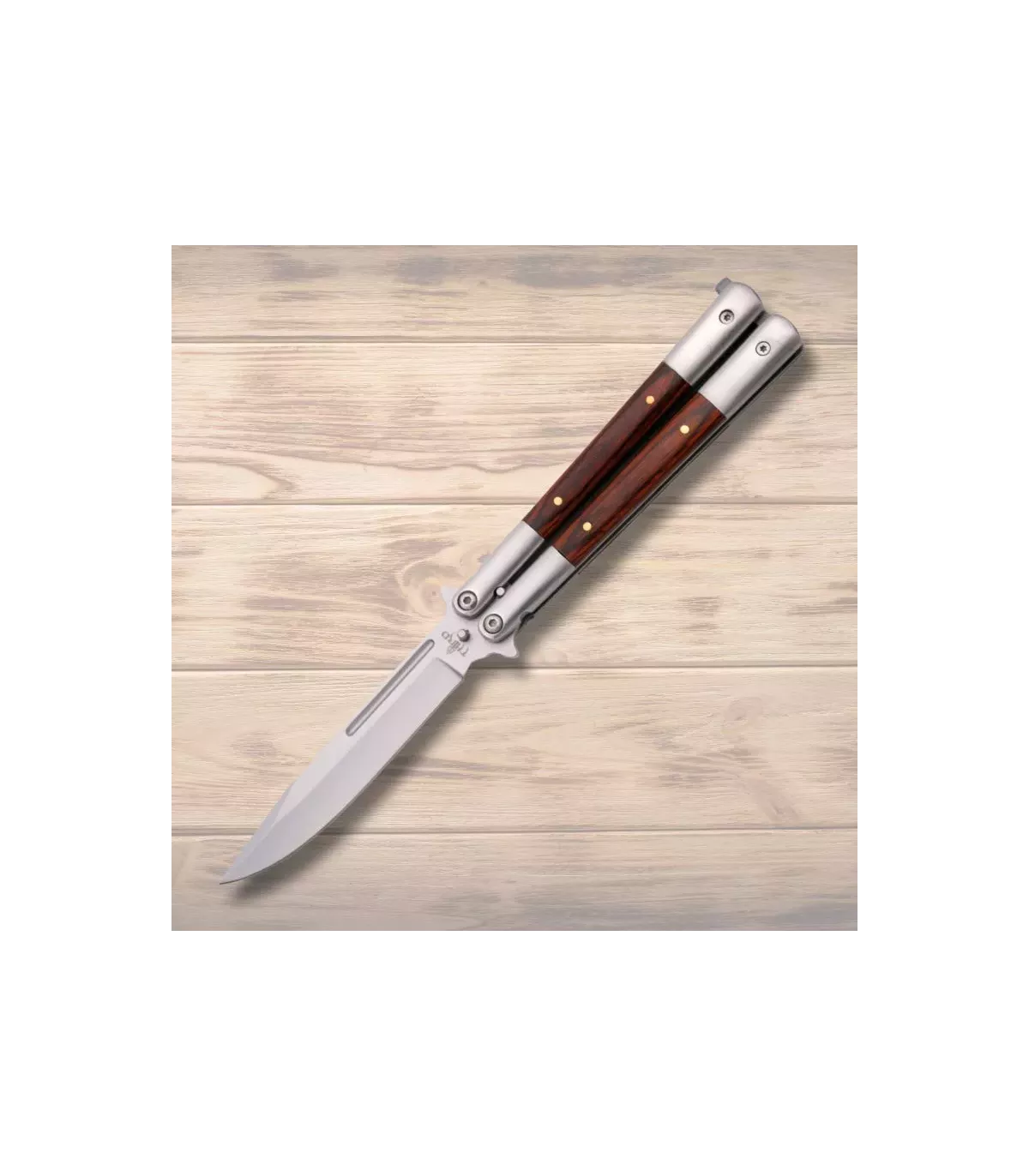 Gracias a su mecanismo de apertura rápida, esta navaja de tipo balisong te permite desplegarla en un instante, perfecta para demostrar destreza o usarla con precisión en tareas cotidianas. La hoja curva y afilada de 8.5 cm facilita cortes exactos, mientras que su longitud total de 22 cm la convierte en una pieza versátil y elegante.
