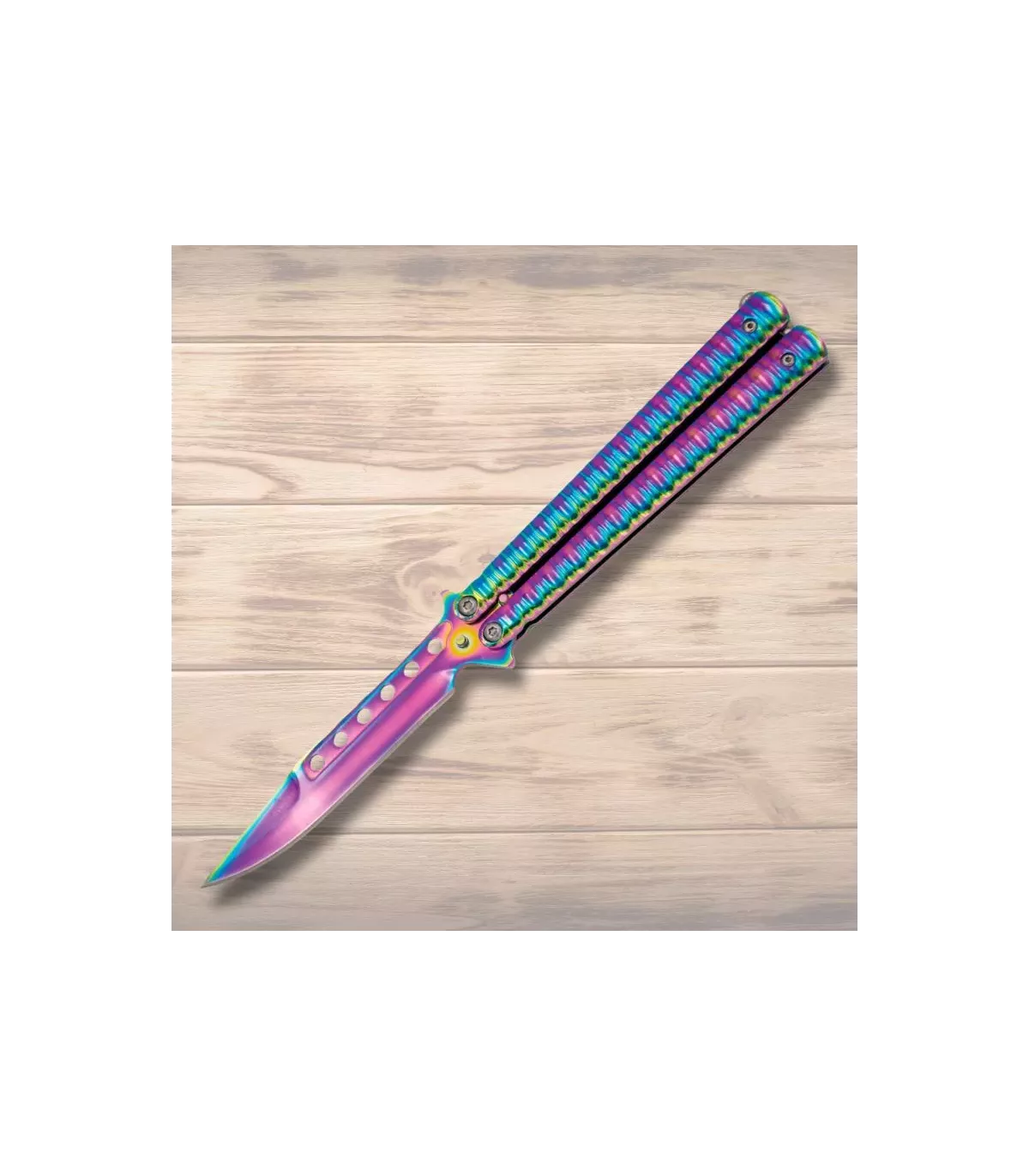 El atractivo principal reside en su acabado en titanio rainbow brillante, que realza cada detalle con un efecto iridiscente que va desde tonos púrpura hasta verdes y azules. La hoja, con orificios que reducen peso y aportan estética, se complementa con un mango de acero inox, que presenta un efecto de olas y también bañado en titanio rainbow. Ambos elementos no solo brindan una apariencia llamativa, sino que garantizan durabilidad y facilidad de uso.