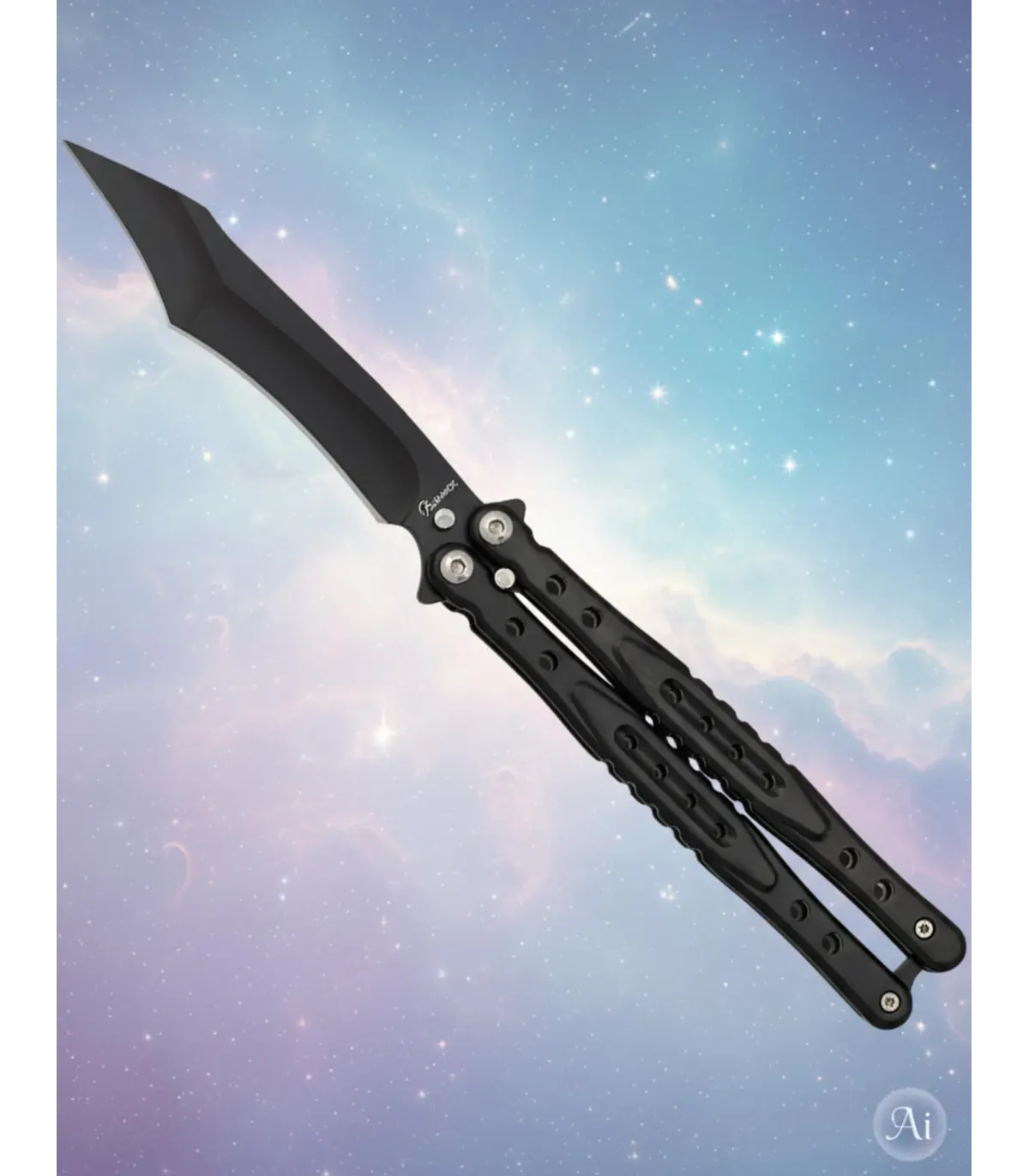 Este cuchillo de mariposa no incluye funda, ideal para quienes buscan un producto listo para llevar y usar. Presentado en caja individual, es perfecto para coleccionistas o entusiastas del mundo del cuchillo, proporcionando un toque distintivo a su colección. La imagen muestra un ejemplar con acabado negro pulido en la hoja y mate en el mango, resaltando su diseño elegante y resistente.
