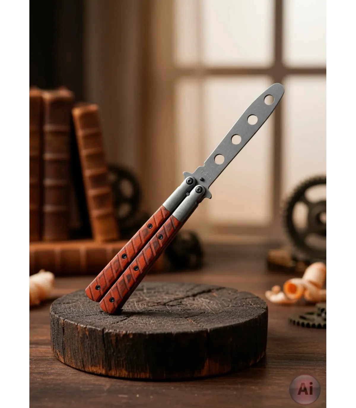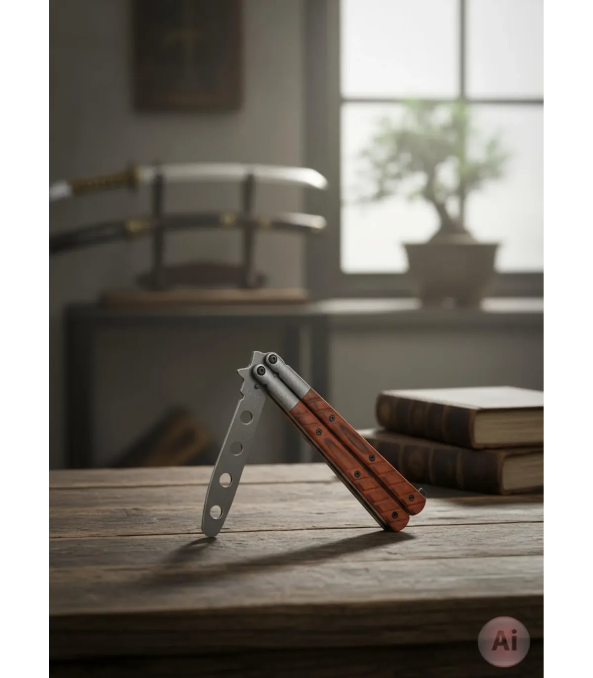 Su diseño inspirado en los cuchillos balisong o mariposa permite maniobras ágiles y controladas, ideal tanto para practicar artes marciales como para exhibir en tu colección. La combinación de colores en marrón y gris metálico realza su aspecto sofisticado, mientras que el mecanismo de apertura y cierre garantiza comodidad y eficiencia.
