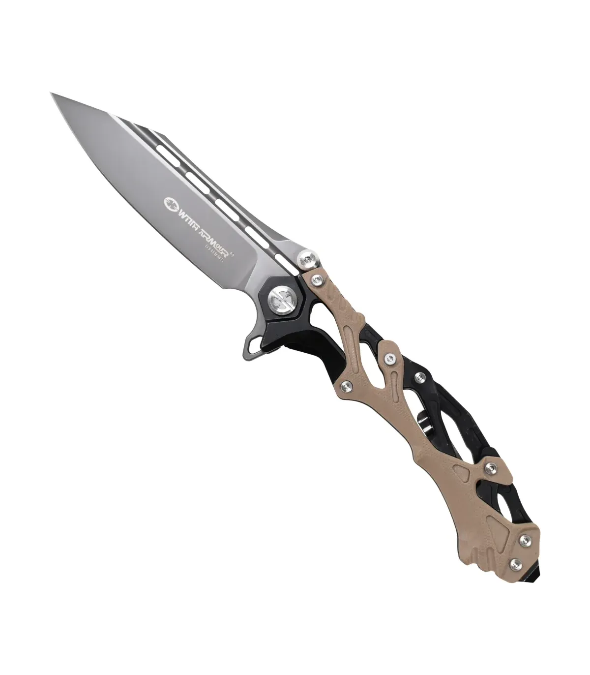 El mango está pensado para adaptarse a tu mano con comodidad y firmeza gracias a una combinación de acero inoxidable y escalas de G10, un material que aporta resistencia y un agarre seguro incluso en condiciones adversas. Además, su diseño esqueleto no solo reduce el peso, haciendo que sea fácil llevarlo contigo, sino que también añade un toque moderno y robusto que encantará a los entusiastas del estilo táctico.