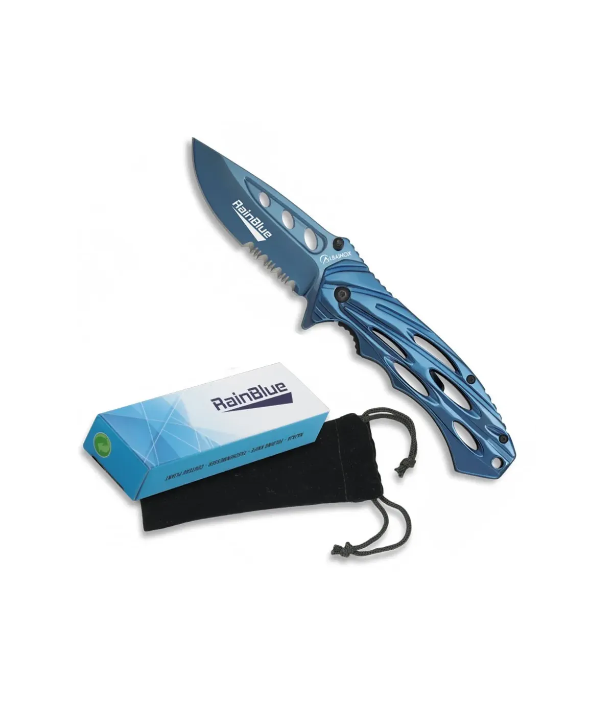 - Diseño Vanguardista: Con un diseño que fusiona lo moderno con lo elegante, esta navaja es un testimonio del enfoque innovador de Rainblue. La hoja de 8,6 cm de acero 3Cr13Mov presenta un tipo de hoja calado, lo que añade un toque de intriga y originalidad.