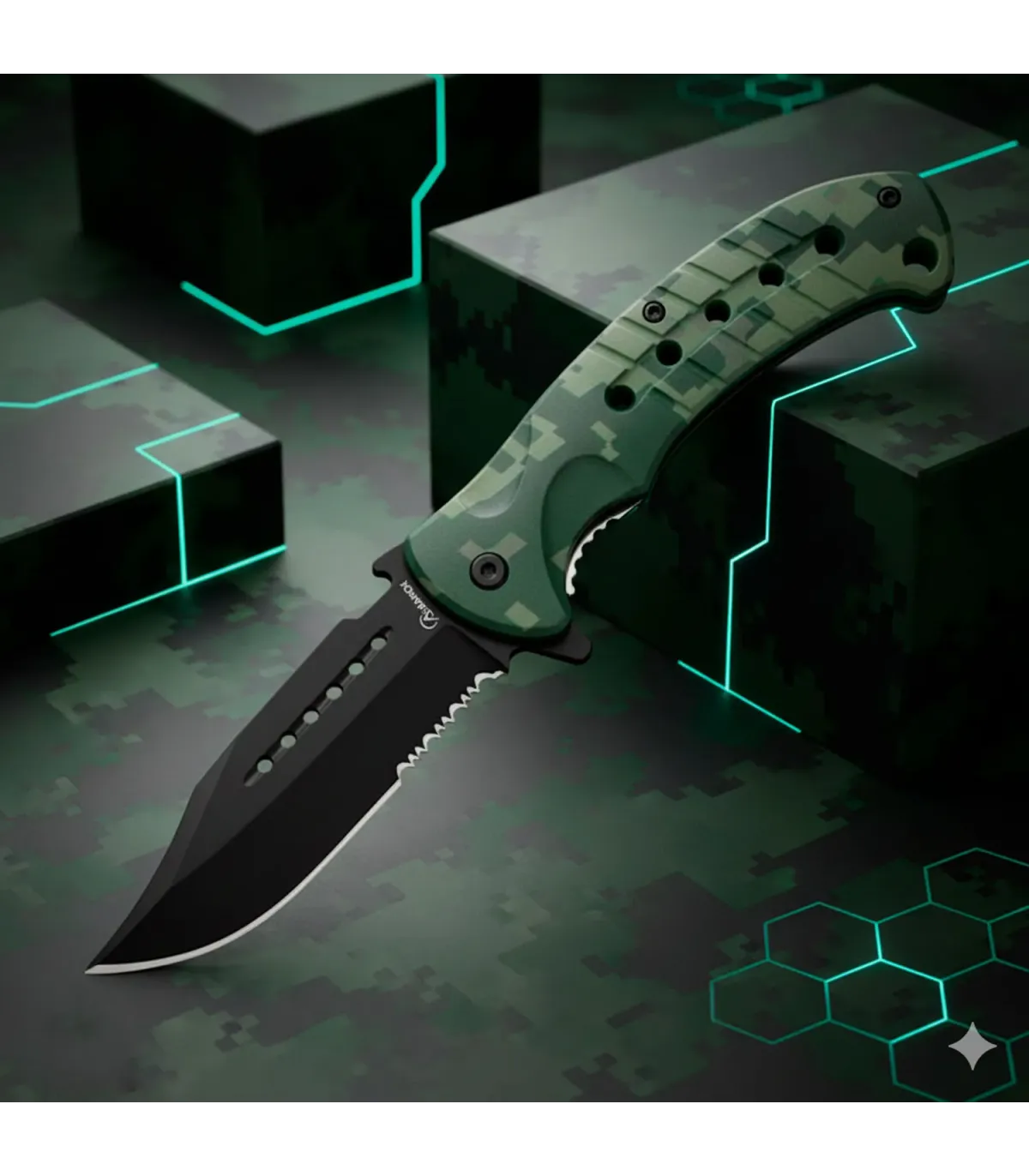 El mango en ABS con patrón de camuflaje en tonos verdes no solo aporta un toque táctico, sino que también garantiza un agarre firme y cómodo, incluso en condiciones exigentes. La presencia de un clip metálico facilita llevarla siempre a mano, ya sea en tu cinturón o mochila.