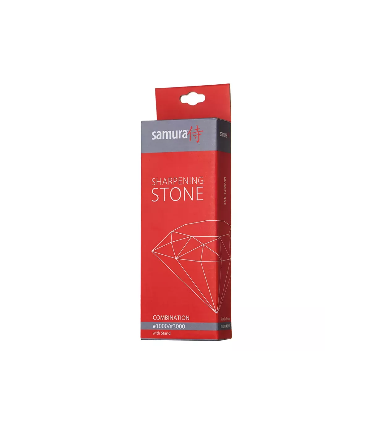 Pierre à aiguiser Samura à grain 1000/3000. Avec cette pierre à aiguiser combinée de haute qualité de Samura, vous pouvez effectuer l'affûtage préliminaire et le polissage fin de vos couteaux, garantissant un résultat exceptionnel. Le côté 1000 affûte votre couteau pour le travail de coupe quotidien. Le côté 3000 affûte votre couteau à la netteté d'une lame de rasoir.