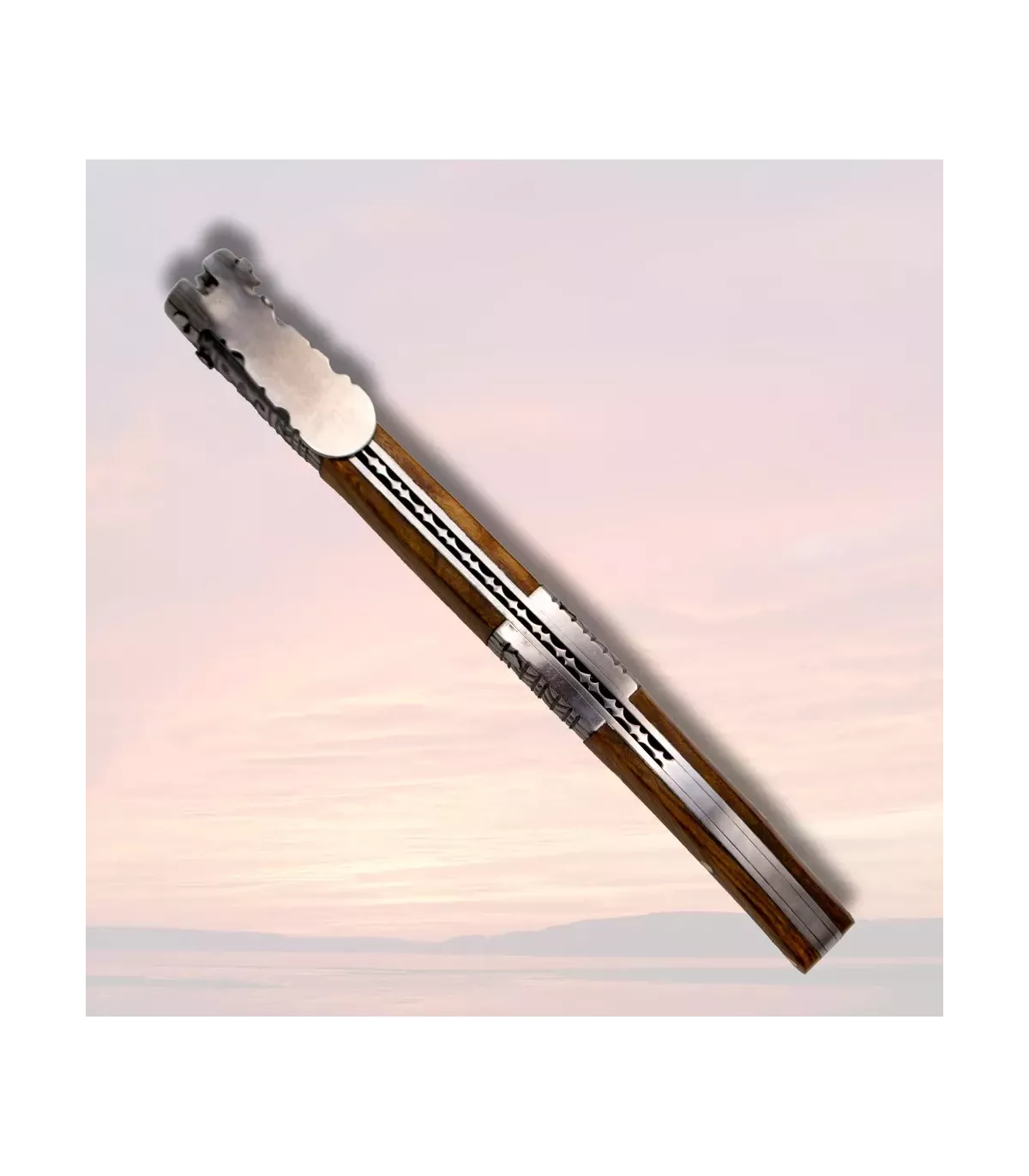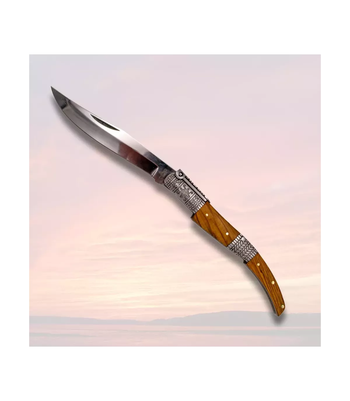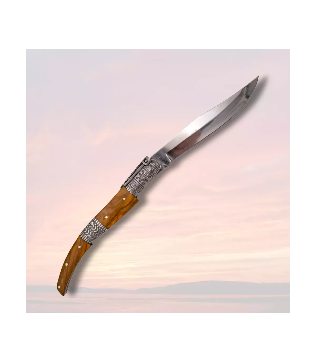 Le manche, en bois d'olivier, apporte non seulement une touche chaleureuse et naturelle, mais son design courbé s'adapte parfaitement à la main, garantissant une prise en main confortable et sûre. Les viroles en acier inoxydable, ornées d'un relief décoratif en bas-relief, ajoutent une touche de sophistication qui en fait une pièce digne d'être exposée.