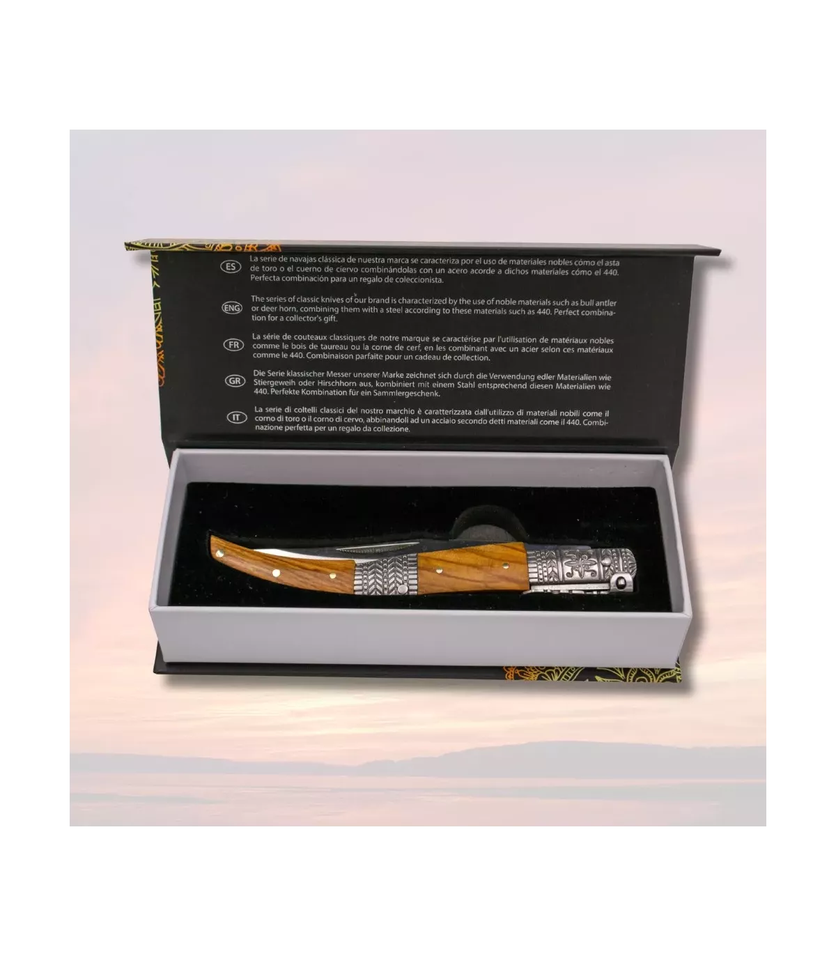 Avec un design inspiré des couteaux classiques espagnols du XIXe siècle, ce couteau se distingue par sa lame en acier 440, qui brille avec une finition miroir, reflétant la qualité et le soin apportés à sa fabrication. La courbure de la lame n'est pas seulement esthétique, mais améliore également ses performances, permettant des coupes précises et douces.
