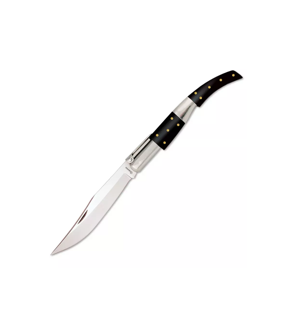 Le Couteau Arabe Carraca Modèle 00 avec poignée en stamina noire est un outil élégant et robuste qui mêle tradition et modernité. Inspiré par le design arabe classique, ce couteau se distingue par son système d'ouverture à 'carraca', qui émet le son caractéristique lors de l'ouverture, évoquant les couteaux traditionnels utilisés par les bergers et les paysans dans le passé. Cependant, le modèle 00 apporte une touche contemporaine avec le choix de matériaux de haute qualité et des finitions raffinées.
