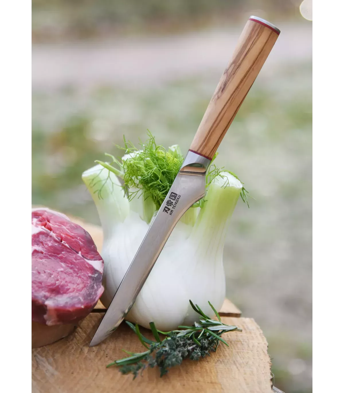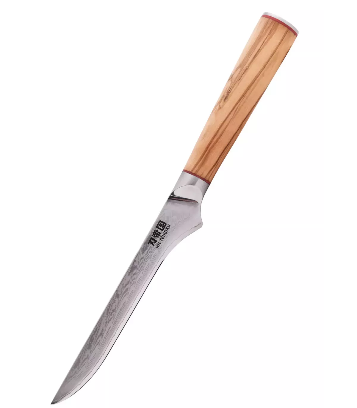 Couteau de cuisine type désosseur avec lame en acier damassé de 67 couches. La lame aiguisée de ce couteau de cuisine vous permet d'effectuer pratiquement toutes les tâches de coupe en un clin d'œil. La poignée élégante en bois d'olivier s'adapte confortablement à la main et offre une prise en main sûre lors de la coupe.