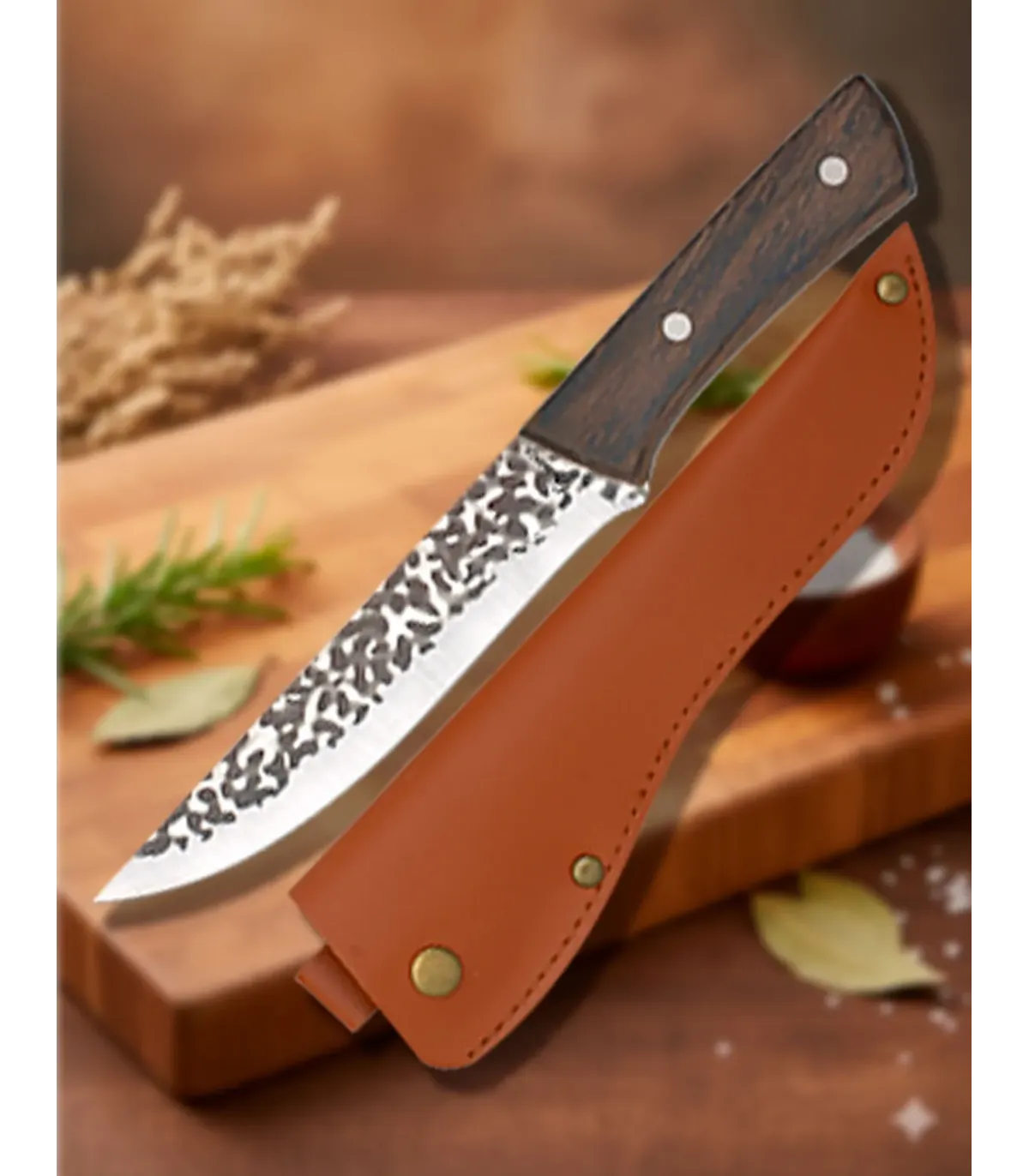 La poignée en bois, avec des rivets métalliques, apporte non seulement une touche classique et attrayante, mais aussi une prise en main ferme et sécurisée lors de l'utilisation. La gaine en simili cuir marron, avec des détails cousus et une fermeture, protège la lame et facilite son transport en toute sécurité. De plus, tout est présenté dans une boîte, idéale pour offrir ou conserver avec soin.