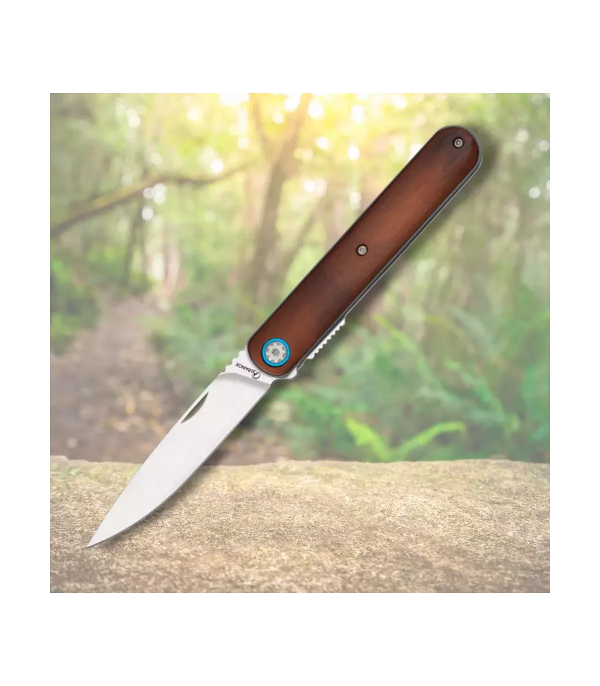 Son acier de haute qualité offre un tranchant durable et une finition satinée qui protègent non seulement contre l'usure, mais offrent également une ouverture douce et fiable. La conception ergonomique de la poignée, combinant aluminium et une texture imitant la chaleur du bois, garantit une prise en main confortable et sûre, idéale pour de longues journées en plein air ou des tâches quotidiennes.