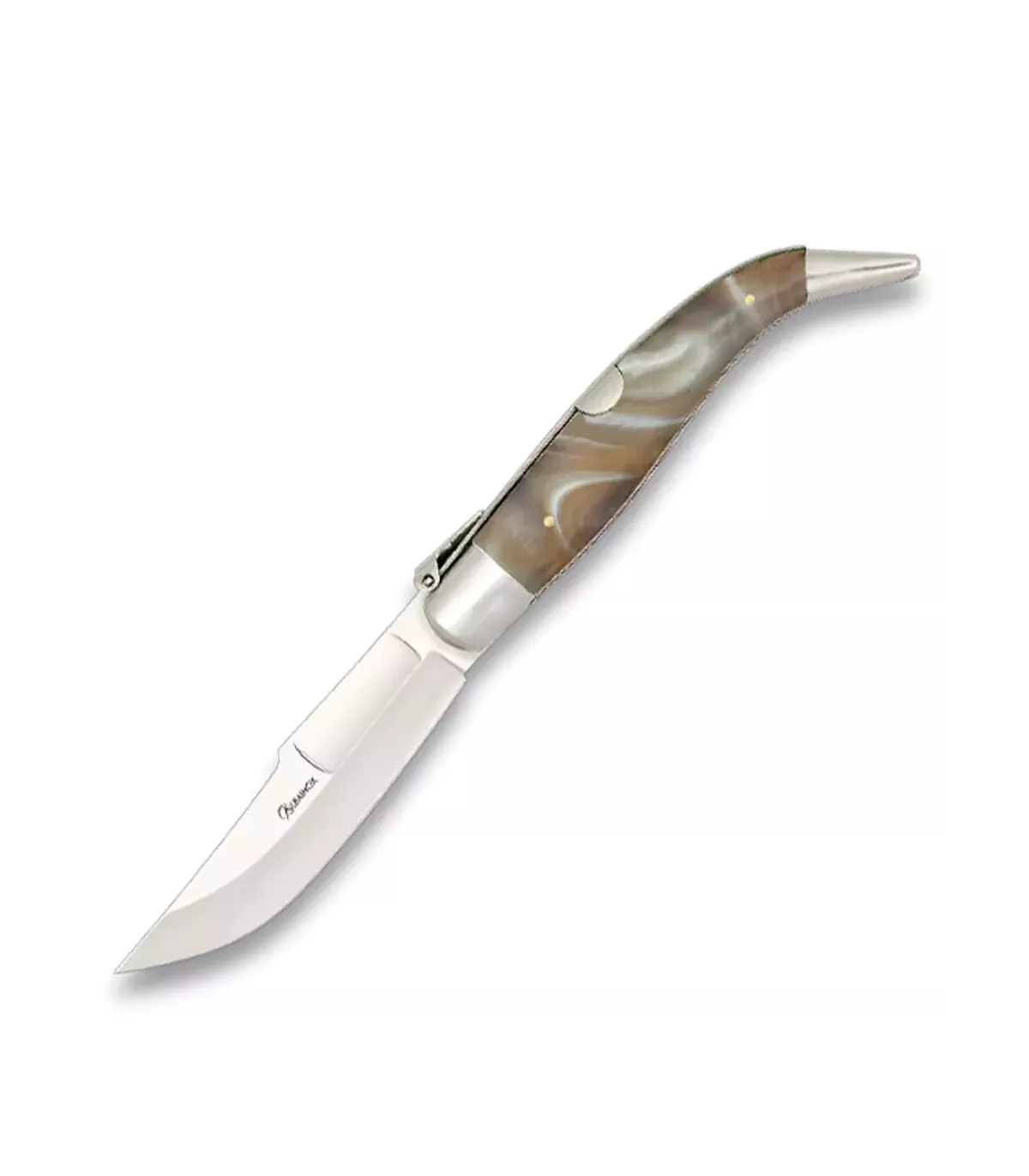 La poignée, avec sa finition élégante en imitation nacre, apporte une touche de distinction. Son design est non seulement esthétique, mais garantit également une prise en main confortable et ferme. Le contraste de la poignée avec la virole et les garnitures en aluminium renforce la structure, la rendant légère mais robuste. Le verrouillage à levier offre une sécurité supplémentaire lors de l’utilisation, empêchant la fermeture accidentelle de la lame, ce qui augmente la confiance lors de la manipulation.