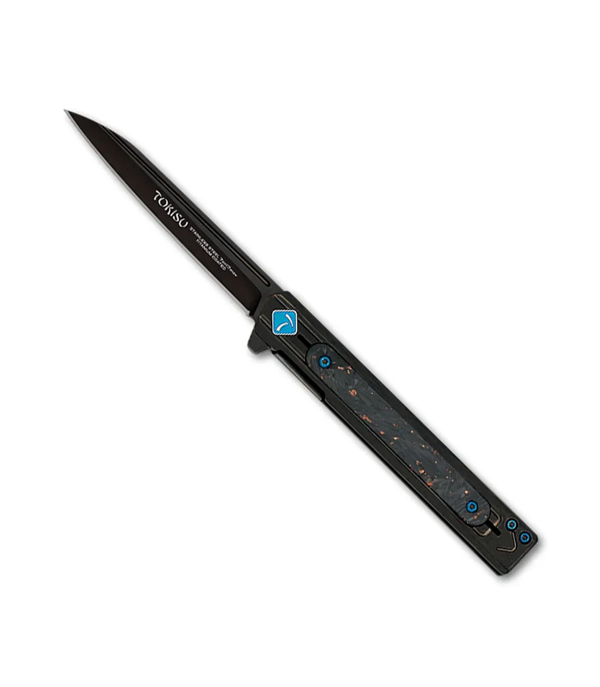 Le manche, recouvert de titane noir avec fibre de carbone, combine légèreté et prise en main ferme grâce à sa texture antidérapante. Les détails en bleu sur les vis apportent une touche de style distinctive, faisant de ce couteau bien plus qu’un simple outil, c’est une déclaration de goûts raffinés !