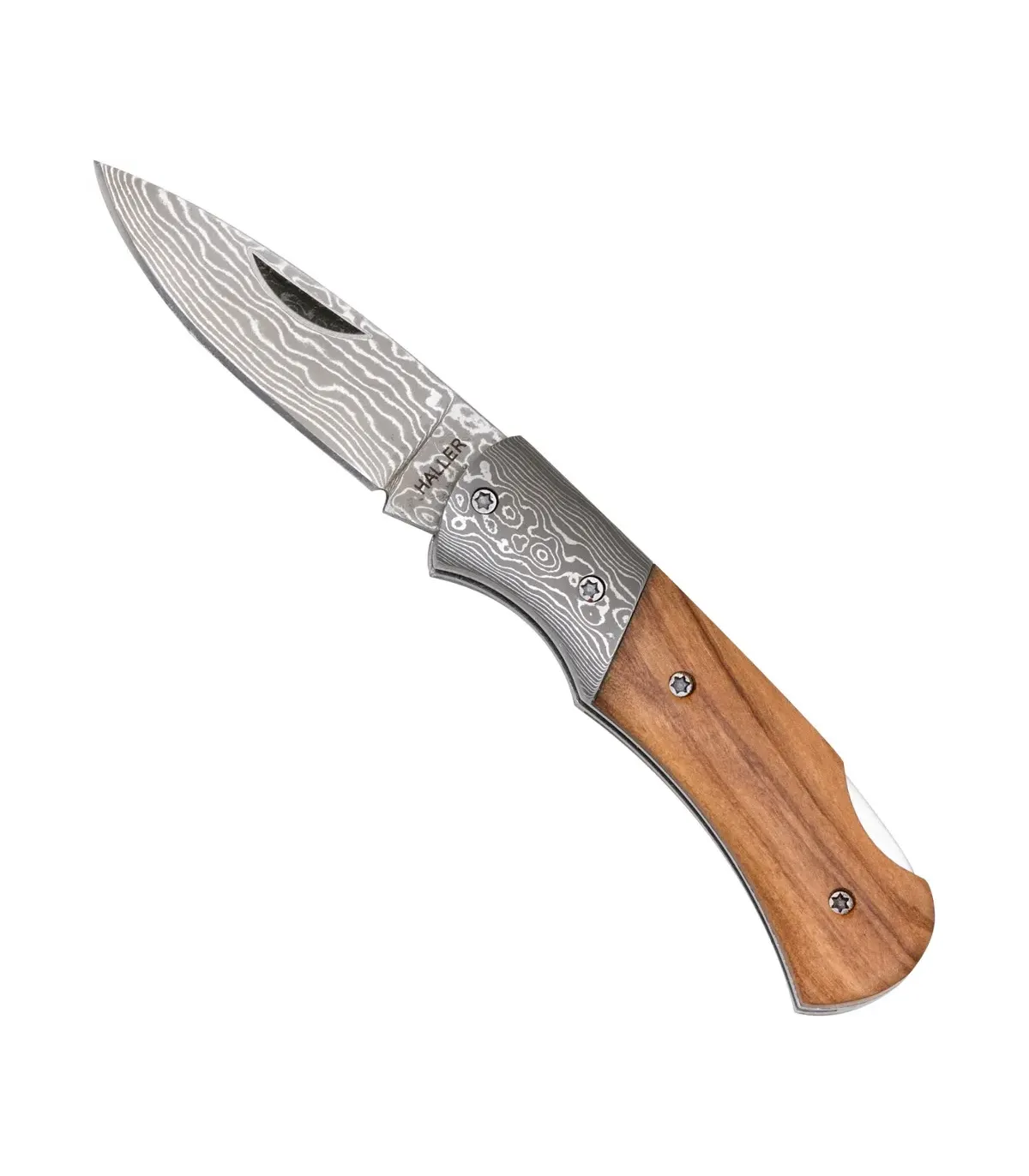 La poignée combine une section métallique avec le même motif Damasque et un morceau de bois d'olivier poli, créant un contraste chaleureux et raffiné. L'ergonomie de sa courbure et la prise ferme, accentuée par les vis visibles, offrent une prise en main confortable et fiable, idéale pour une utilisation prolongée sans fatigue.