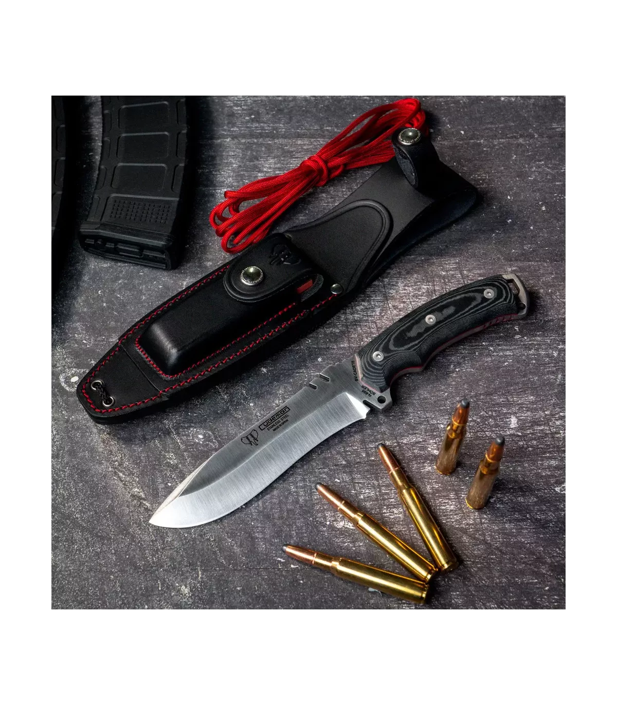 La poignée en micarta noire offre une prise en main confortable et sûre, même dans des conditions humides. De plus, le étui en cuir inclus protège le couteau lorsqu'il n'est pas utilisé et vous permet de l'emporter partout avec vous.