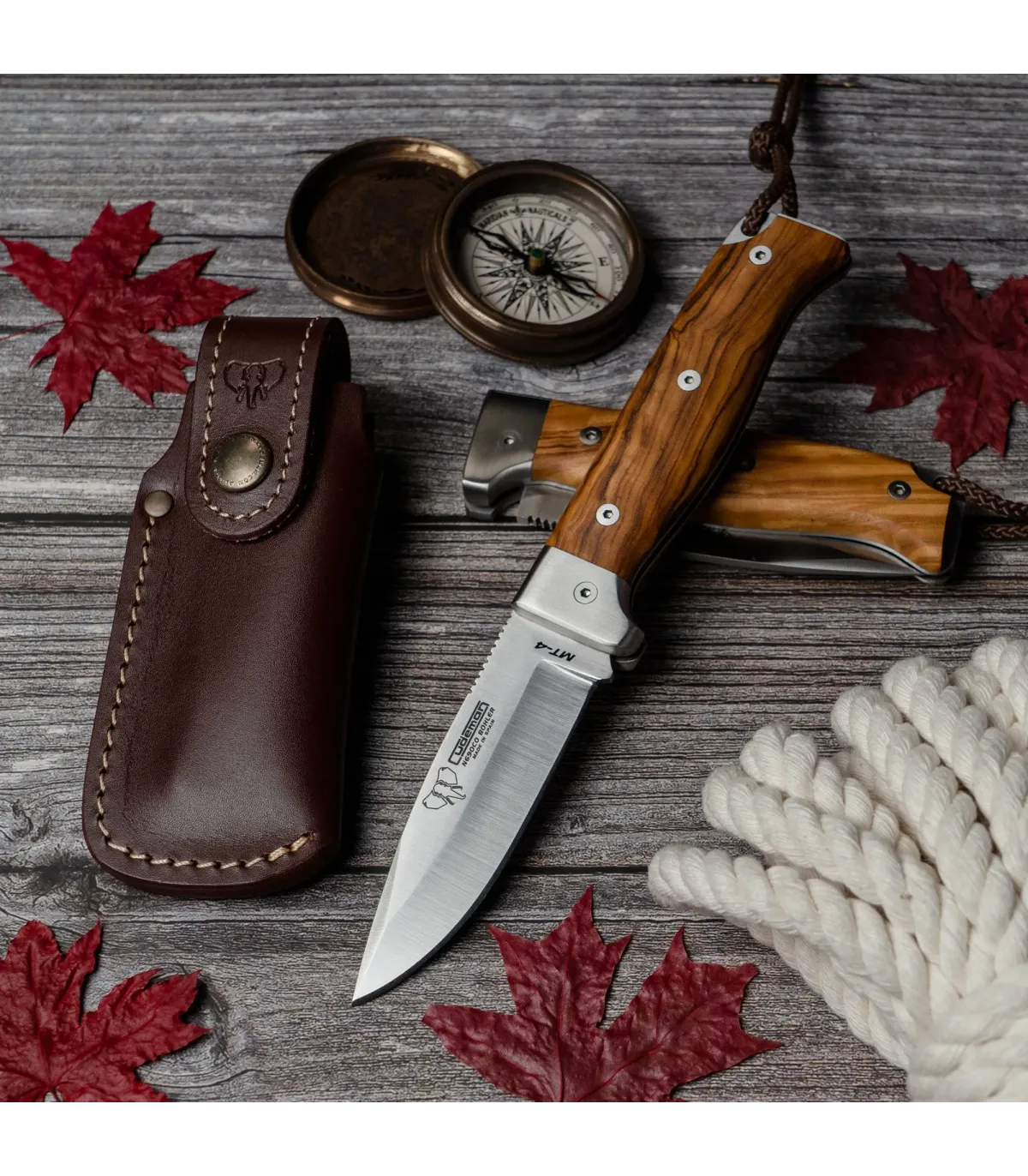Sa lame en acier Böhler N690Co, avec un profilé et une finition satinée impeccables, vous garantit une coupe précise et durable. Sa pointe en forme de Drop-Point offre polyvalence et sécurité en toutes situations. De plus, sa dureté de 60/61 HRc assure une résistance exceptionnelle, adaptée à vos besoins les plus exigeants. Avec son système de verrouillage arrière, vous pouvez avoir la tranquillité d'esprit que votre couteau restera sécurisé et stable lors de son utilisation. L'ancrage du manche par vis Allen en inox et le bouchon intérieur fileté en laiton offrent une solidité unique et une sensation de qualité à chaque mouvement. Mais ce n'est pas tout, le manche en olivier naturel satiné confère à ce couteau un aspect élégant tout en offrant une prise en main ferme et confortable pour une manipulation précise et ergonomique. Et pour compléter cette merveille, le couteau MT-4 est livré avec un étui en cuir marron, garantissant une protection optimale et un transport sécurisé.