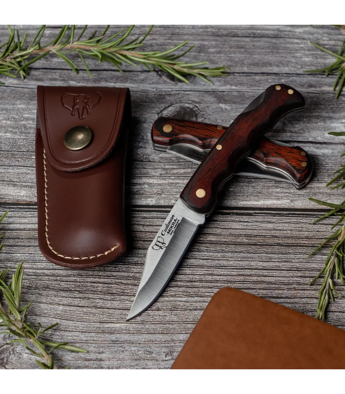 Le système de fermeture avec verrouillage arrière garantit la sécurité et la stabilité de la lame pendant son utilisation. L'attache du manche avec un fil de laiton assure une construction résistante et durable. Le manche en estamine rouge satinée n'est pas seulement esthétiquement attrayant, mais offre également une prise en main confortable et ferme lors de son utilisation. L'estamine est un matériau durable et élégant qui ajoute une touche distinctive au couteau. De plus, le couteau de chasse Mikra est livré avec un étui en cuir marron de haute qualité, qui protège non seulement le couteau en toute sécurité, mais vous permet également de le transporter commodément et de le maintenir en parfait état.
