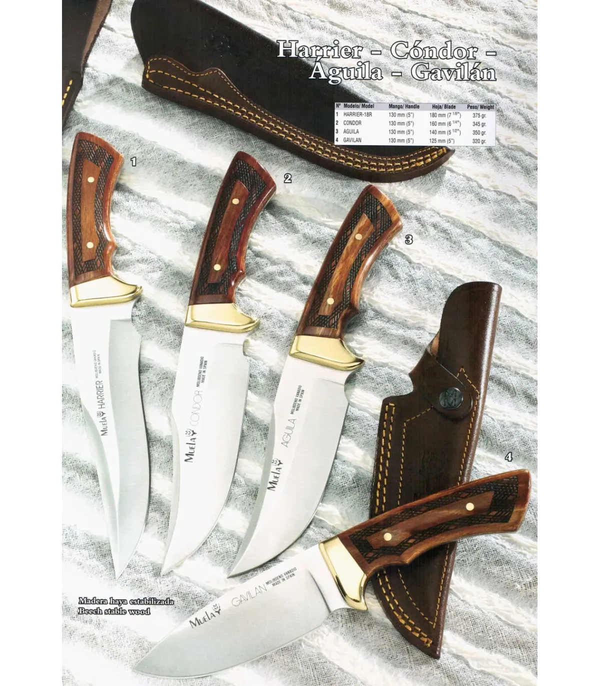 La société espagnole Muela a acquis une réputation pour son engagement envers la qualité et l'excellence dans la fabrication de couteaux. Les modèles Harrier, Cóndor, Aigle et Faucon avec lame monobloc, manches en bois gravé et laiton ne font pas exception, ayant été produits avec le souci du détail et la précision qui caractérisent la marque.