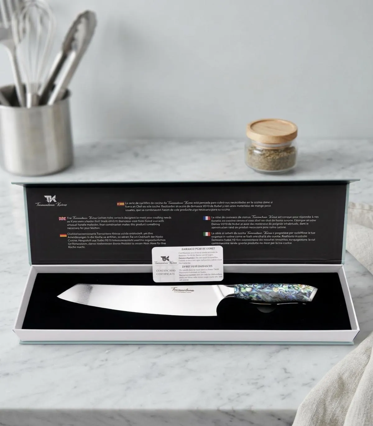 | Comment vous différencie-t-il en cuisine ? | Son motif sophistiqué sur la lame et sa poignée décorative élèvent votre style et votre autorité dans chaque préparation. |