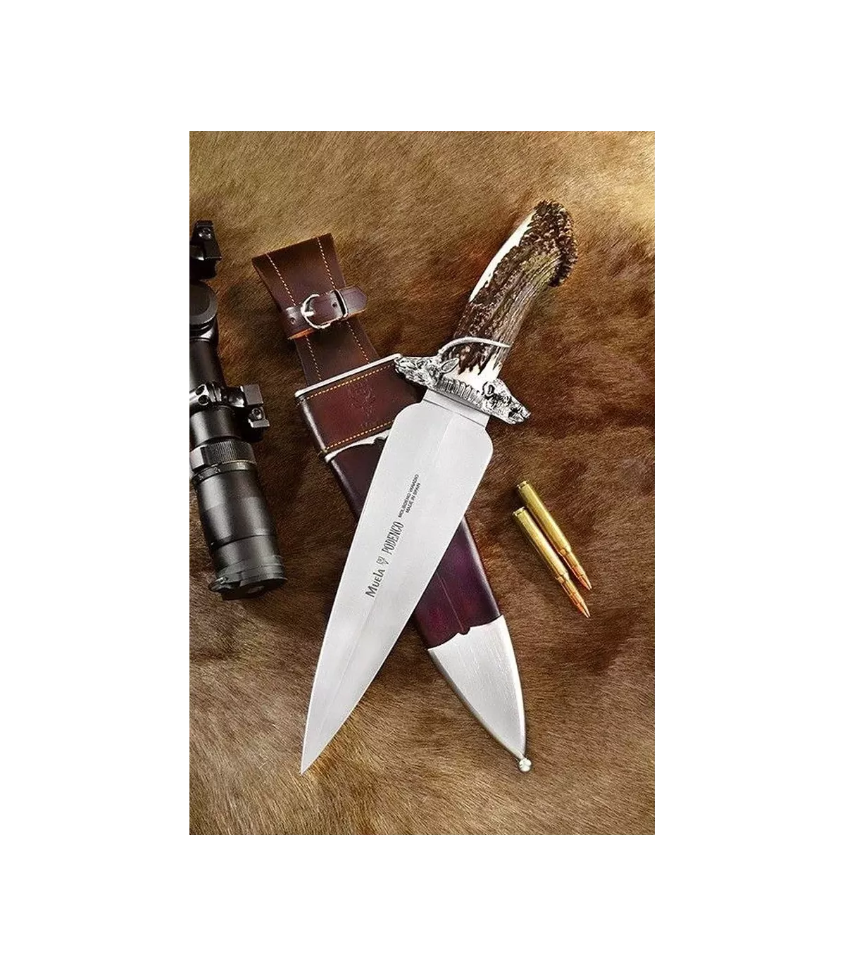 Le manche, élaboré en bois de cerf, apporte non seulement une esthétique élégante et rustique, mais offre également une prise en main confortable et sûre. De plus, la garde et la pièce en argent massif, incrustée à l'extrémité du manche, ajoutent une touche de luxe et d'exclusivité.