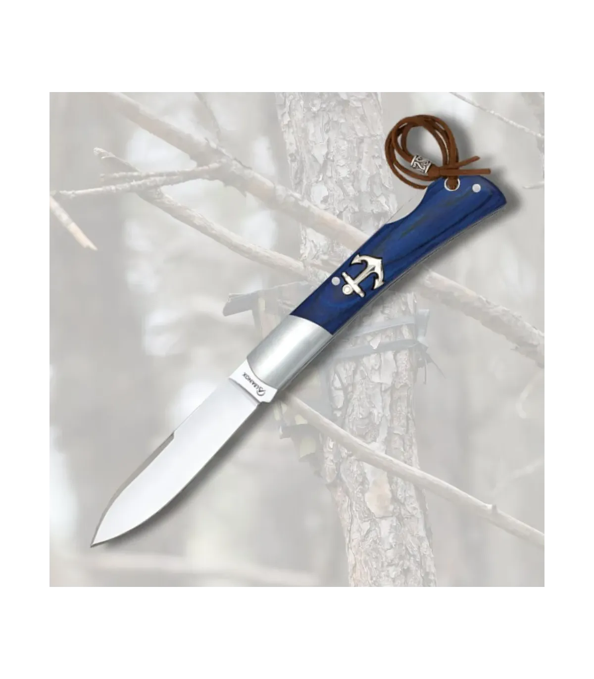 Le manche, d’un vibrant bleu avec des veines, n’est pas seulement attrayant visuellement, mais offre également une prise en main confortable et sûre. Son design, comprenant un détail métallique en forme d’ancre, ajoute une touche de distinction qui en fait un objet de collection pour les amateurs d’activités en plein air.