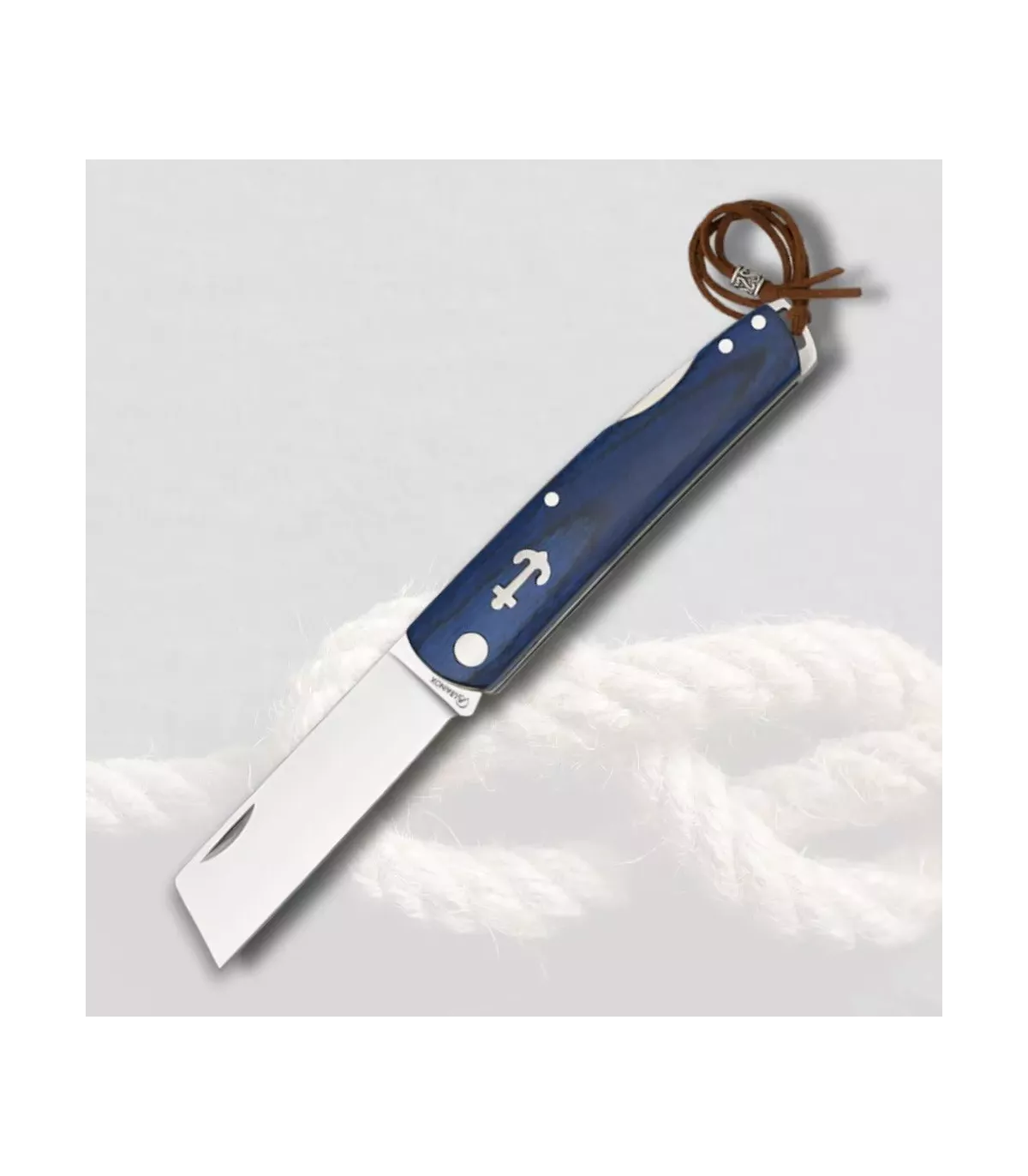 Le manche, fabriqué en bois de Stamina d'une élégante couleur bleue, est non seulement agréable au toucher, mais se distingue également par son esthétique soignée. Il comprend des détails uniques tels qu'une gravure d'ancre en ton clair et deux points décoratifs évoquant un style nautique sophistiqué. De plus, il est équipé d'une cordelette ajustable avec un nœud et un ornement métallique qui vous permet de le tenir ou de le transporter confortablement et en toute sécurité.