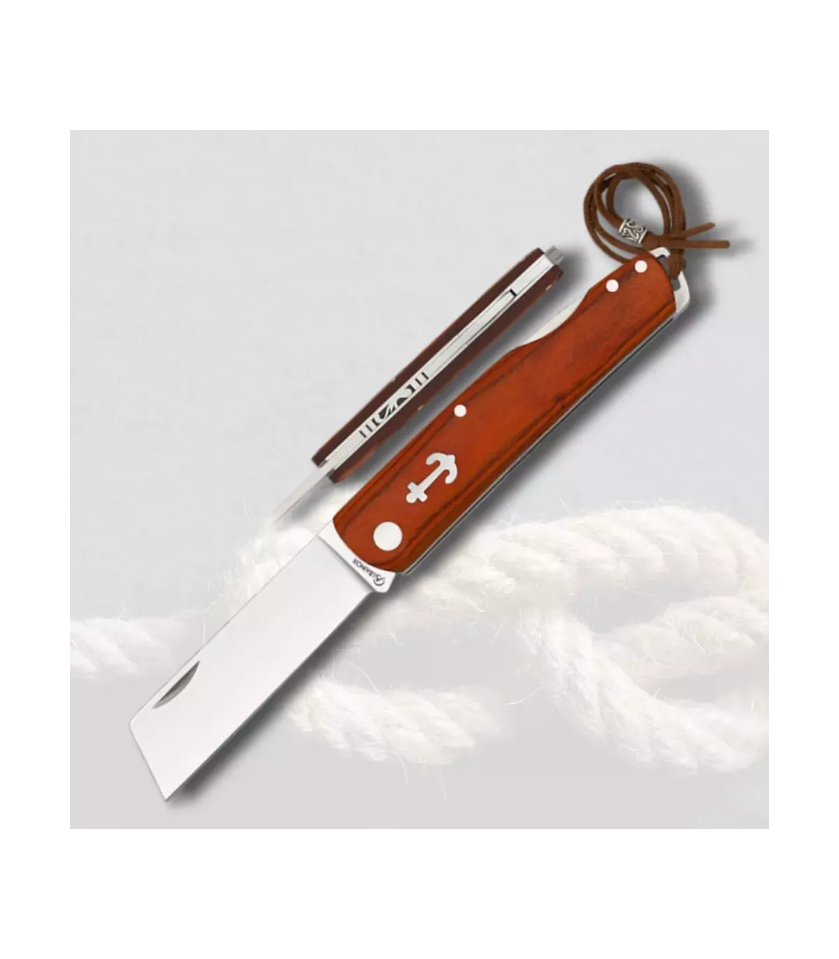 Le manche de couleur rouge, fini en stamina, apporte non seulement une touche chaleureuse et naturelle, mais assure également une prise en main confortable grâce à sa forme ergonomique. Complétant son design, la gravure d'une ancre blanche et les détails en argent évoquent le véritable esprit marin, en faisant un outil attrayant et fonctionnel.