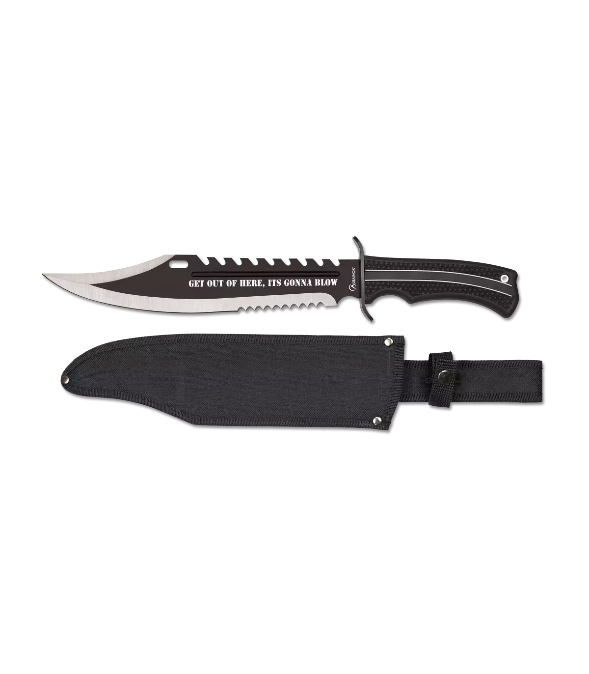 La gravure sur la lame, 'Get out of here, it's gonna blow', ajoute une touche unique et distinctive, soulignant la nature préparée de ce couteau tactique. De plus, le étui en nylon facilite son transport et son stockage, garantissant qu’il soit toujours à portée de main lorsque vous en avez besoin.