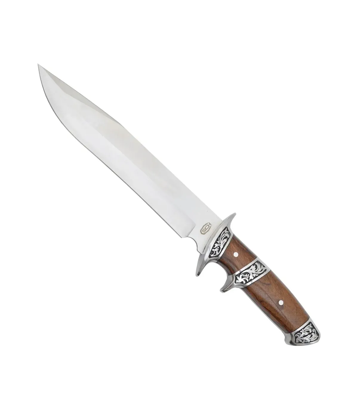 La garde métallique gravée apporte sécurité et élégance, tandis que la poignée, avec rivets et pièces ornementales métalliques sur une surface rappelant le bois, assure une prise ferme et confortable. Cette combinaison de matériaux permet une manipulation stable et une sensation de contrôle, aussi bien pour des travaux délicats que pour des manœuvres plus puissantes.