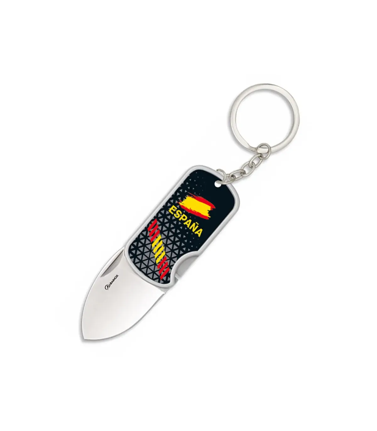 Navaja-llavero Bandera española, con hoja en acero 3CR13MOV satinado de un solo filo y mango en aluminio + 3D con clip para cinturón. Tipo de bloque Frame Lock. Tamaño de la hoja: 4 cm.