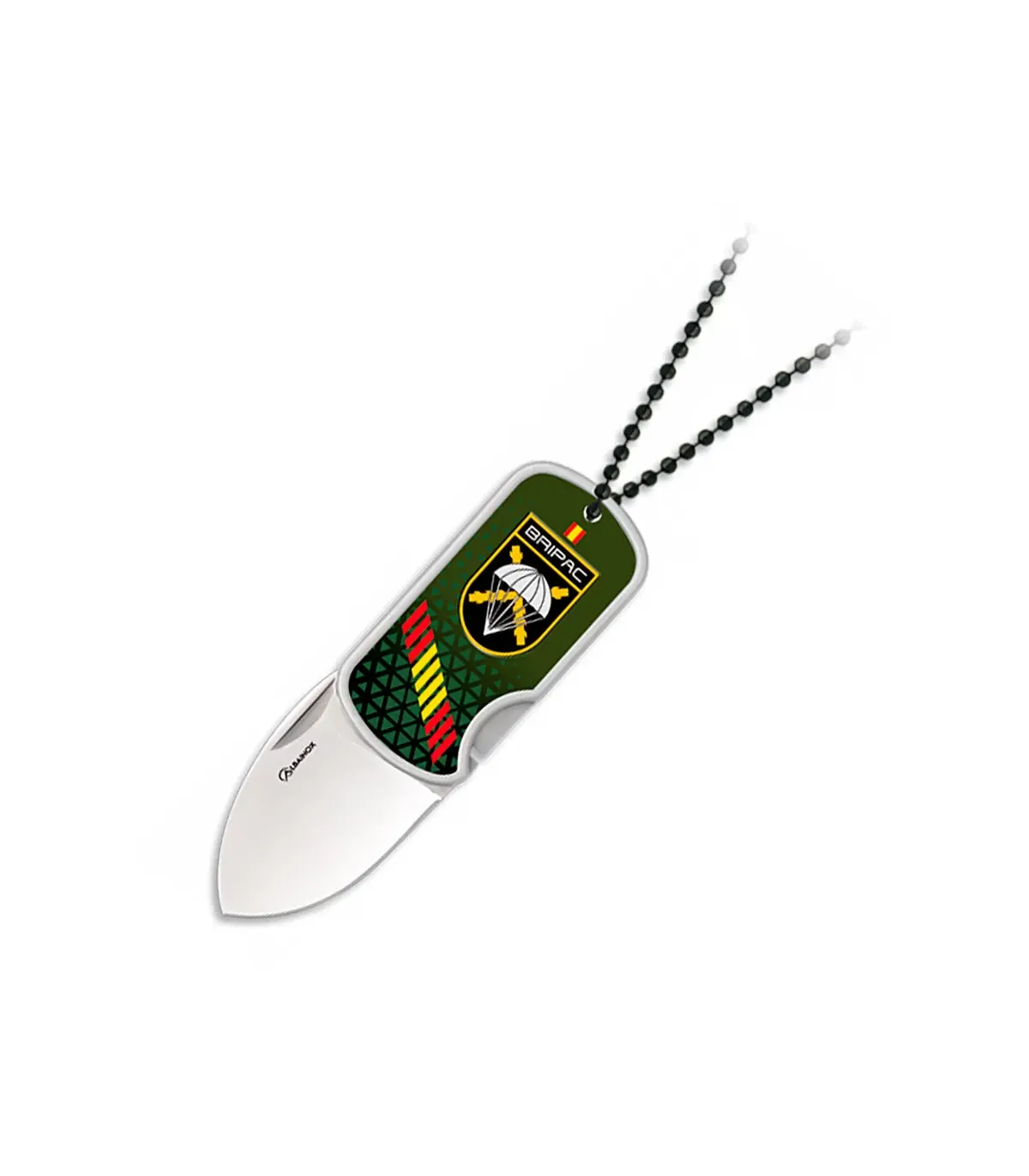 Navaja Bripac, Brigada de Infantería Ligera Paracaidista española, con hoja en acero 3CR13MOV satinado de un solo filo y mango en aluminio + 3D con colgante de bolas. Tipo de bloque Frame Lock. Tamaño de la hoja: 4 cm.
